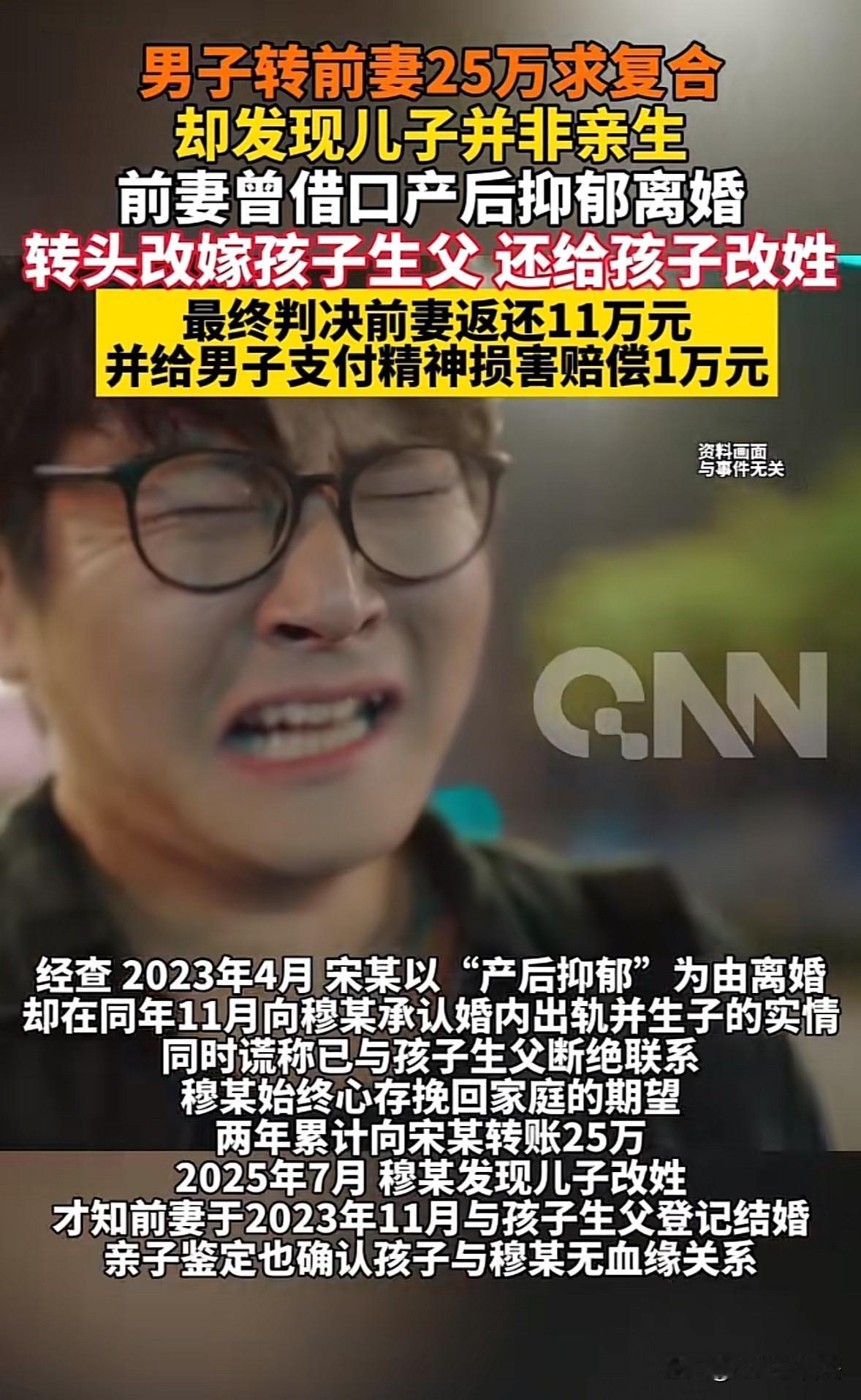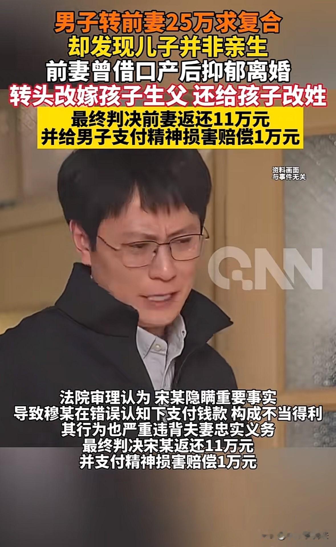 山西孝义,女子以产后抑郁为由提出离婚,离婚后7个月女子承认婚内出轨并产子,称已与孩子生父断绝关系。为挽救婚姻,男子转账25万,2年后却意外发现儿子医保卡改姓,才得知女子2年前就已与孩子生父登记。男子起诉女子还钱,法院判决很意外。 2023年4月对于穆某来说很特殊,因为在这个月,穆某同时失去了妻子和儿子,妻子宋某提出了离婚。 在不久前还是幸福的小两口,准备迎接新生命的到来,却在宋某生产后发生很大的变化,让穆某都不知道该怎么做才是对的,才能不让宋某生气。 宋某和穆某结婚后不久就怀孕了,十月怀胎很是辛苦,穆某十分体谅宋某,体贴入微,关怀备至,就怕委屈了宋某,让宋某和肚子里的孩子遭罪。 在穆某的照顾下,宋某终于生下一个儿子,可把穆某高兴坏了,从那开始,穆某的眼里就只有儿子和妻子。 许是生产前后激素影响的原因,宋某生完孩子之后,看穆某就鼻子不是鼻子,眼睛不是眼睛的,横竖都看不过去。 穆某理解女人生孩子遭的罪,不和宋某一般见识,也鲜少和宋某吵架,但是穆某的隐忍却没有换来宋某的理解,反而变本加厉。 在2023年4月,宋某再也忍不了,就以自己生产后抑郁为理由提出离婚。因孩子还小,所以离婚后孩子归宋某所有。 穆某虽然不想离婚,但是宋某坚持,穆某只能答应宋某的要求,在离婚协议书上签了字。 离婚后的穆某整个人都垮了,他还爱着宋某,想念孩子,他希望能和好,哪怕让他去改掉自己的臭毛病,只要宋某能回到他身边,无论让他做什么都可以。 就这样,穆某在离婚后还在不断以各种各样的理由和宋某联系,宋某最终在7个月后和穆某坦白了一件事,希望穆某能够放过自己。 原来在婚姻存续期间内,宋某做了对不起穆某的事情,而且宋某生下来的儿子也不是穆某的血脉。 穆某听到这个消息犹如五雷轰顶一般炸裂,他怎么都没有想到自己心心念念的女人竟然做出这样背叛自己的事情。 宋某还表示已经和孩子的生父断绝了关系,话里话外的意思,孩子的生父配不上当孩子的爹。 穆某本就对宋某还有感情,一听到宋某背叛自己可能是有情可原的情况,就决定原谅宋某,还希望宋某能够回到自己的身边。 穆某甚至为了挽回婚姻,不断给宋某花钱买东西,比结婚的时候,甚至是结婚前花的都大方。 穆某的目的很明确,宋某也知道,但是宋某就是一直也没答应复婚。穆某也是一个情种,坚持2年,前前后后花了25万多元,但依旧没有感动宋某。 偶然一次机会,穆某去办事的时候发现儿子医保卡的姓氏改了,不再姓穆,但是也不姓宋,而是第三个姓氏。 穆某不明白到底是怎么一回事,于是上门去找宋某询问情况。这一去才发现,原来宋某早在2023年11月的时候,就已经与孩子的生父领证结婚了。 而那个月,就是宋某坦白自己出轨的日子,也是穆某想要重新追回宋某的时候。 穆某终于感受到了什么叫真正的人财两空,钱花了,人没回来,然后儿子也改了别人的姓。 穆某不甘心,他不信宋某会这样对待他,于是抓住最后的希望,去做亲子鉴定,结果却发现儿子的确和穆某并无血缘关系。 一连串的打击下,穆某再也不想相信感情和自己的判断力,他不能当冤大头,于是起诉到法院,要求宋某归还25万元。 根据《民法典》第985条的规定:得利人没有法律根据取得不当利益的,受损失的人可以请求得利人返还取得的利益,但是有下列情形之一的除外: (一)为履行道德义务进行的给付; (二)债务到期之前的清偿; (三)明知无给付义务而进行的债务清偿。 穆某声称宋某得到他转账的25万多元属于不当得利,应该进行归还。 穆某给宋某转账25万元是有前提的,目的是为了挽救婚姻,让宋某和自己复婚。 但是宋某却在很早之前就已经与曾经出轨的孩子的生父登记结婚,穆某想要得到的目的无非达成,因此要求宋某归还25万的不当得利。 宋某却认为穆某转账属于自己的行为,而且在2023年11月的时候,宋某已经承认出轨并生子,没有承认和孩子生父结婚,是不想伤害穆某。 穆某转账的时候也并没有明确表示要复婚,所以接受穆某表达爱意的转账也不存在是取得不当得利,因此宋某拒绝归还。 法院审理后认为: 宋某在整个过程中隐瞒了重大事实,也就是已经和孩子生父已婚的事实。穆某在未知这个事实的前提下支付钱款,属于不当得利。 而且宋某在婚姻存续期间严重违背了夫妻忠诚义务,属于过错方,虽然已经离婚,但也应该受到道德的谴责。 最终法院判决,宋某归还穆某11万元,并支付1万元的精神损害赔偿。