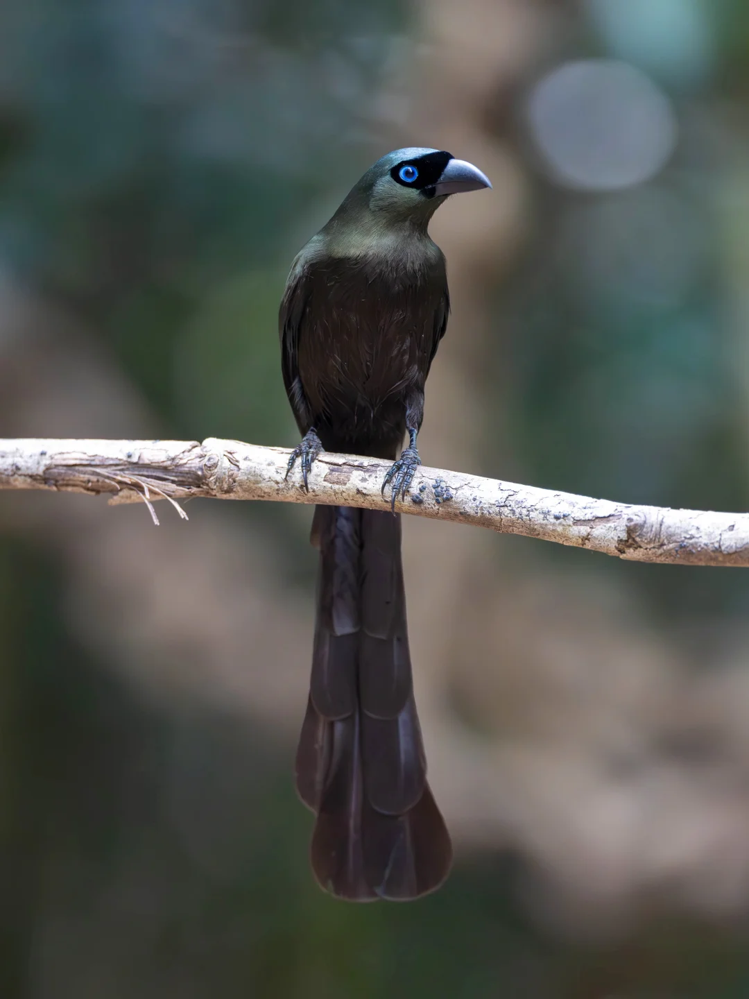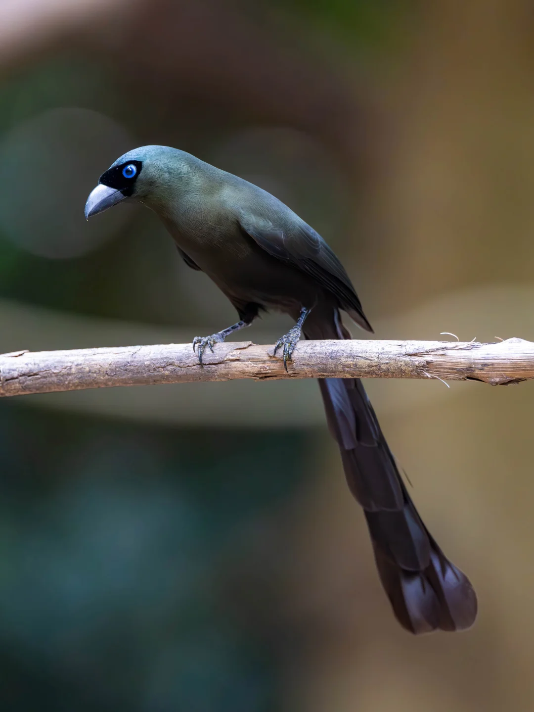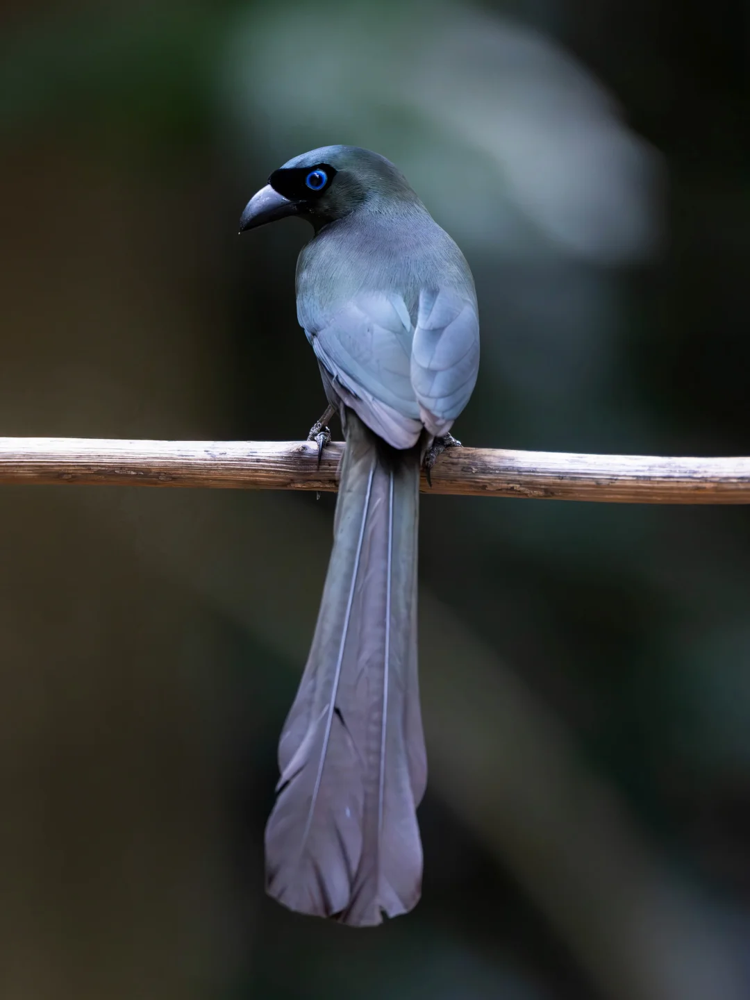 原创拍摄 盘尾树鹊,Racket-tailed Treepie,雀形目鸦科黑头树鹊属。这种鸦科大佬主要分布在东南亚,在我国只分布在云南。 盘尾树鹊的尾巴很长慢慢展开,全身的羽毛深灰色带着铜绿色金属的光泽,非常丝滑,黑色中带着紫绿光,眼睛的虹膜为显著的蓝色,并戴着丝绒黑眼罩。整个身形,光泽,颜色都非常的优雅,优雅到甚至觉得像是外星球来的鸟。不由得嘴里开始念出:优雅永不过时。 不过它们的叫声真的是鸦科的典型,粗糙而吵闹[汗颜R]。