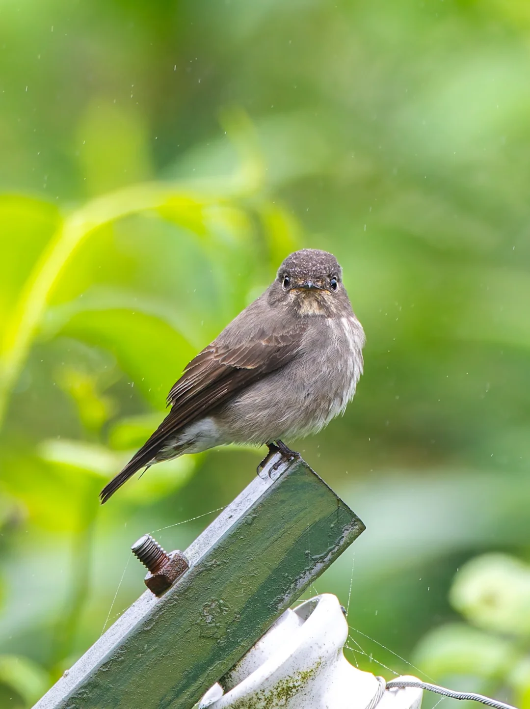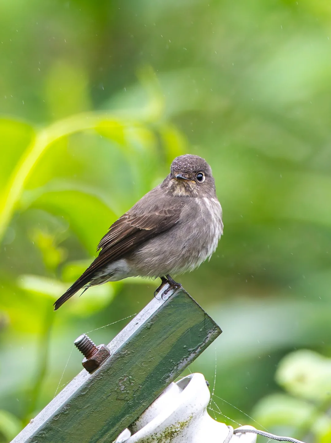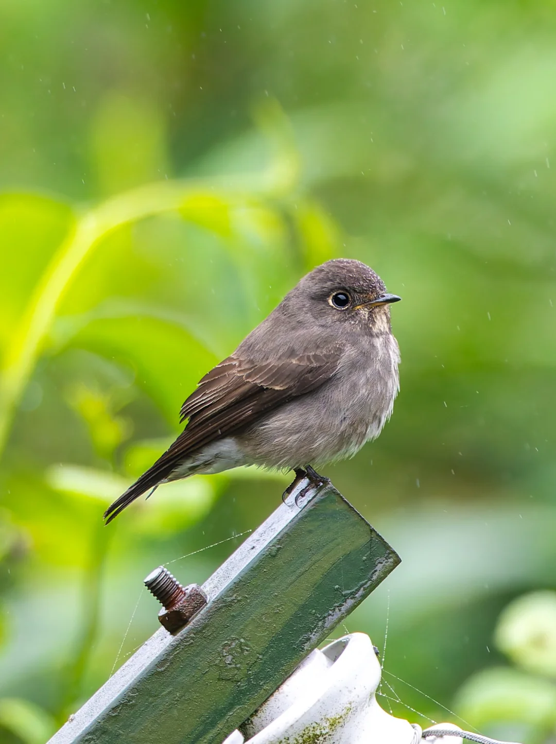 原创拍摄于2025.06 乌鹟,Dark-sided Flycatcher,雀形目鹟科鹟属。在我国,繁殖季节偏好到西部较高海拔地区的森林,而在迁徙和冬季,喜欢开放森林。 乌鹟全身黑黑的,胸部甚至脏脏的,大大圆圆的眼睛,白色眼圈,很独特好识别。 细雨中见到的这只小黑皮,可能有点冷,团成一团,感觉萌了哈哈。