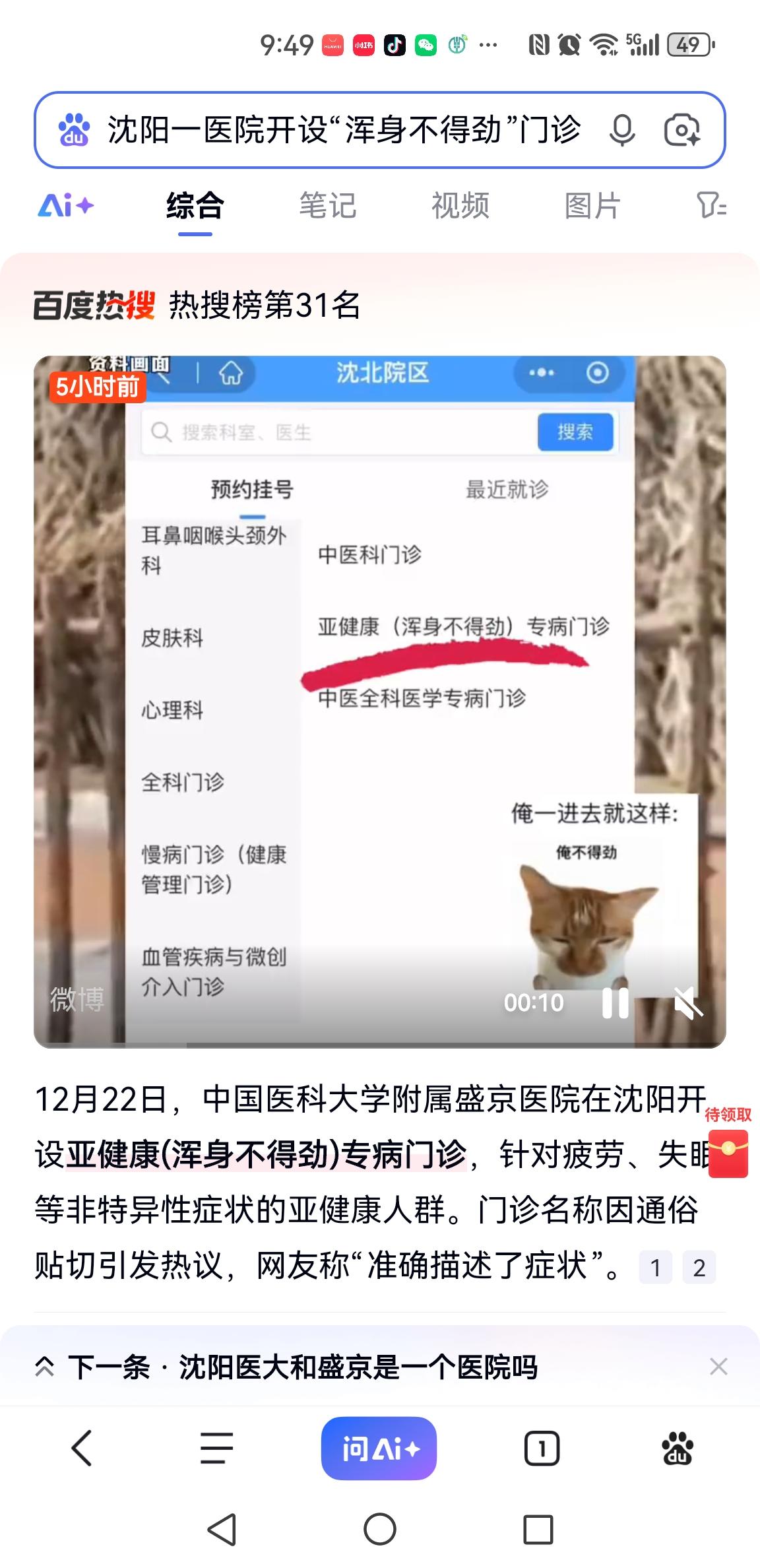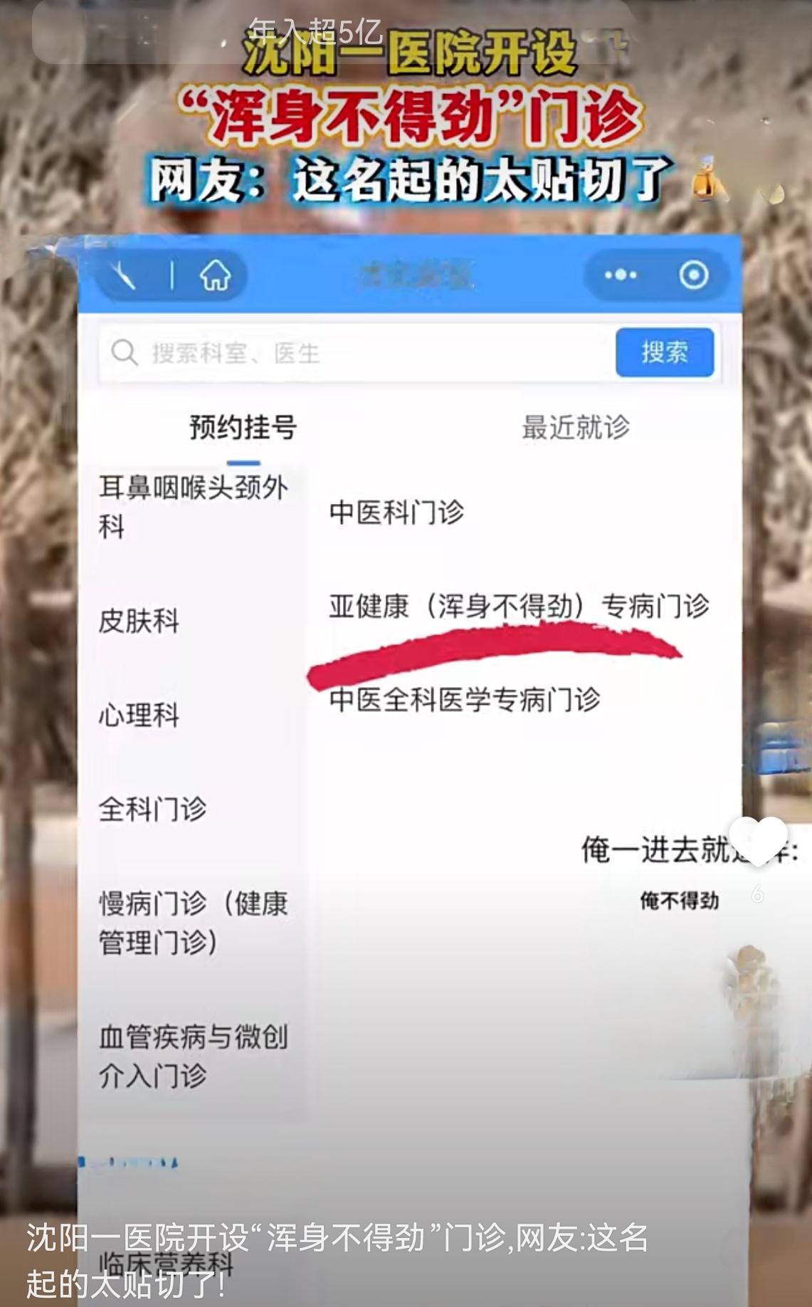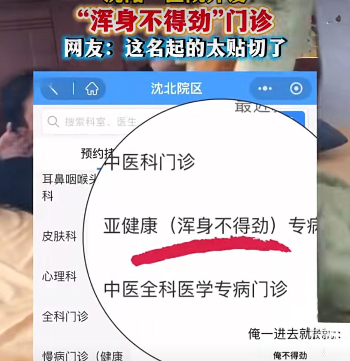 “浑身不得劲”有地儿治了 近日,沈阳中国医科大学附属盛京医院沈北院区中医科推出的“亚健康(浑身不得劲)专病门诊”引发广泛关注。该门诊以直白名称精准切中当代人“体检正常却长期疲惫”的痛点,迅速成为网络热议焦点。 门诊主要面向长期熬夜、压力过大、缺乏运动导致的亚健康人群,症状包括持续疲劳、失眠、肌肉酸痛、情绪低落等,但体检指标无异常。医生通过中医体质辨识、心理评估等手段,结合针灸、推拿、药膳调理及认知行为疗法,制定个性化干预方案。例如,针对气血不足者开具当归补血汤,对焦虑型患者配合冥想训练。 该门诊的爆火折射出社会对亚健康管理的迫切需求。数据显示,我国符合世界卫生组织健康标准者不足15%,超70%人群处于亚健康状态。专家建议,若出现持续2周以上的不明原因乏力,可优先尝试该门诊;若伴随消瘦、水肿、剧烈头痛等症状,仍需及时转诊专科排查器质性疾病。