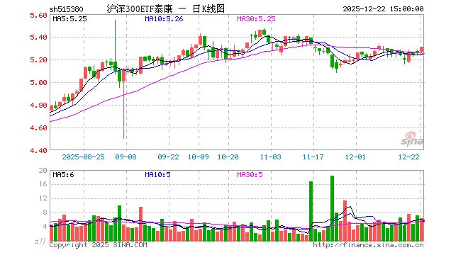 12月22日,沪深300ETF泰康(515380)涨0.95%,成交额3390.32万元。当日份额减少90.00万份,最新份额为7.04亿份,近20个交易日份额减少1440.00万份。最新资产净值计算值为37.37亿元。