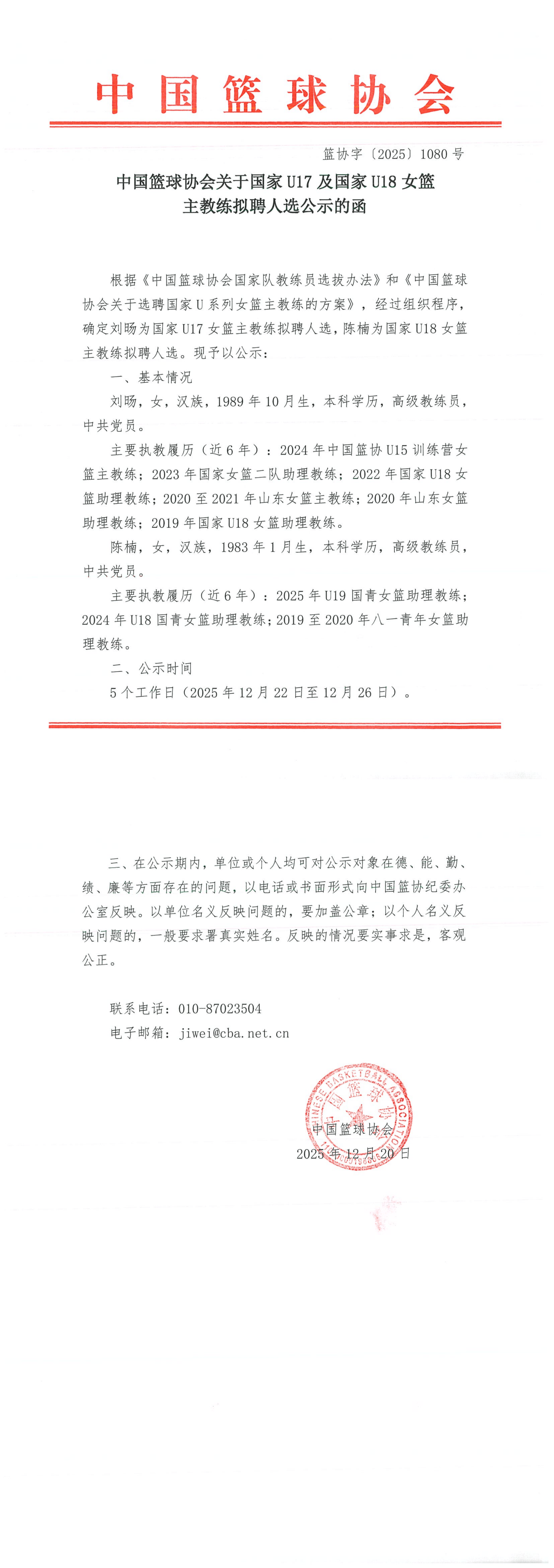 虎扑12月23日讯今日,中国篮协官方发文:陈楠将成为U18女篮主帅,刘旸将成为U17女篮主帅。
