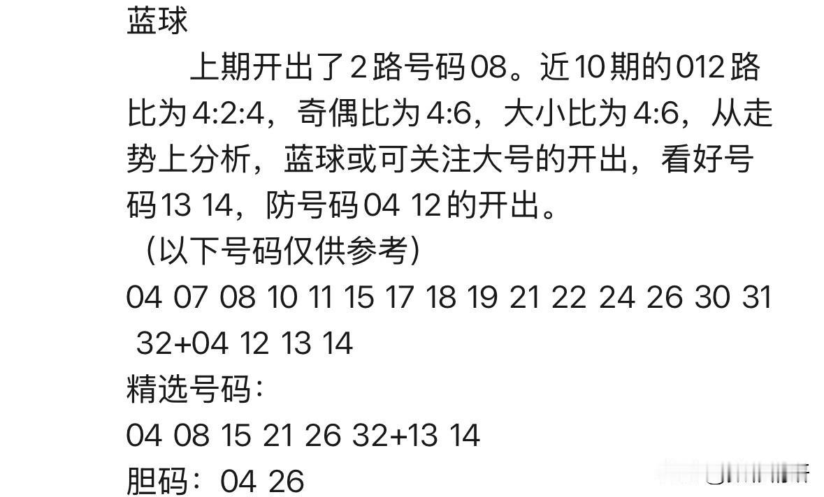 湖北辛丹丹携精选号码重磅来袭!本期红球16+4大底诚意奉上,6+2精选组合新鲜出炉: 红球6码:04、08、15、21、26、32 蓝球4码:04、12、13、14 本期号码亮点解析: 红球斜连码强势出击:04、21、32与上期形成完美斜连走势, 重号延续热态:08强势回归,再现江湖。 蓝球布局:3偶1奇,13、14尤为瞩目,值得重点关注。 上期红球大底虽仅中1码,但彩市风云变幻,本期辛丹丹能否重燃希望之火,再创辉煌?这组精心挑选的号码,究竟是您的参考宝典,还是反选杀号指南?评论区见真章,期待您的独到见解!