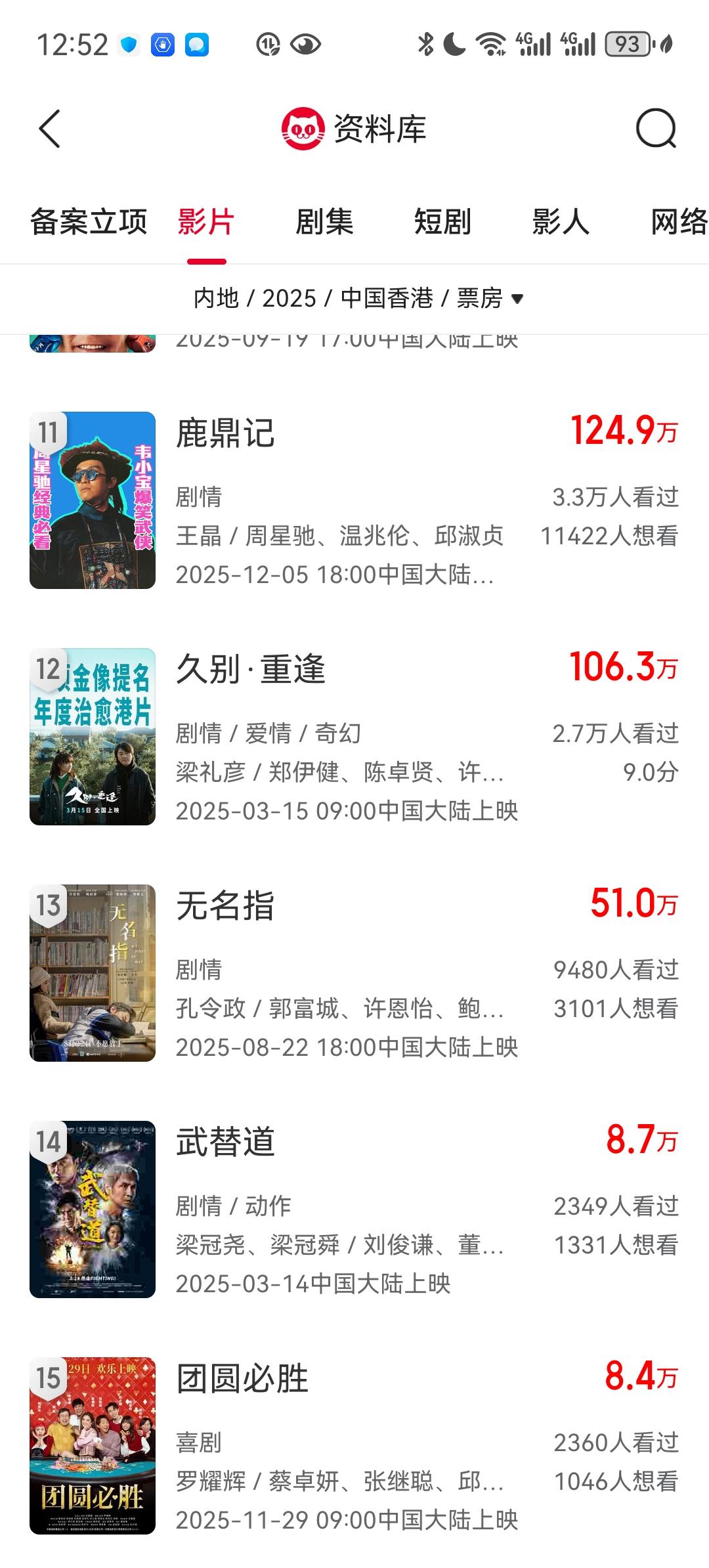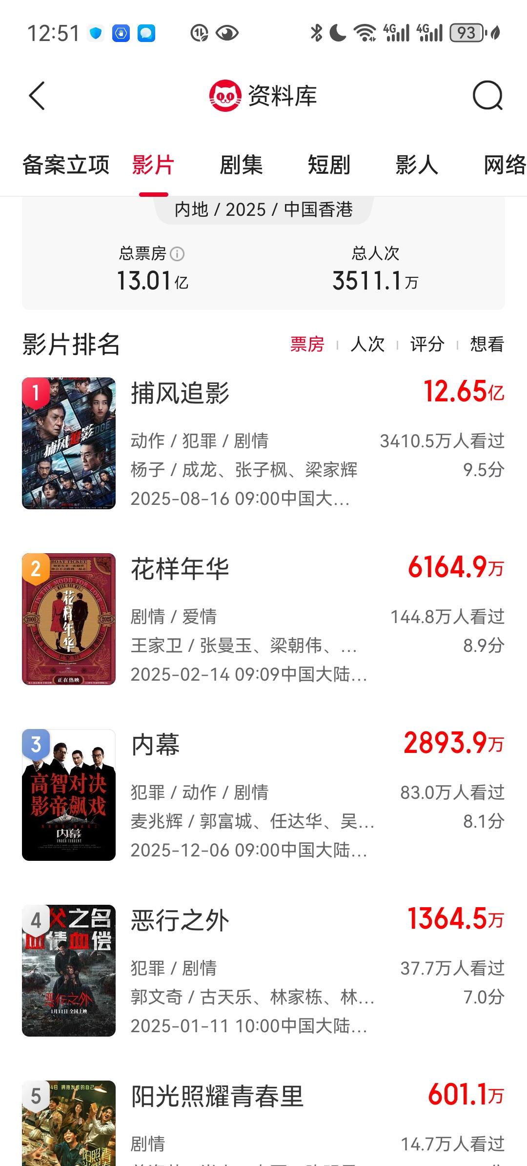 今年香港电影在内地的票房真是太惨淡了!除了捕风捉影取得12.65亿的优异成绩外 ,其他电影没有一部过亿。而且更惨的是,第一名的捕风追影其实是内地电影,只是由两位香港老演员主演而已。第二名的花样年华更是二十多年前的老电影重映。真正的纯香港新电影第一名内幕三千万票房都不到[捂脸]甚至还有好几部是100万票房都不到的,最低的武替道和团圆必胜甚至连10万都不到[捂脸]现在全村的希望就是寻秦记了,估计过亿问题是不大的。但是能不能到5亿甚至10亿以上真的不好说,目前来看还是比较悬。