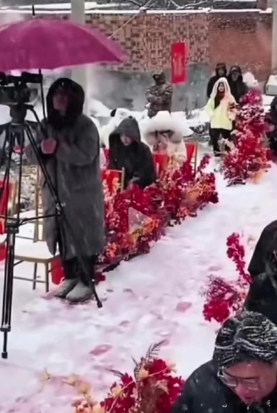 雪中婚礼真是美丽动人。村里男子结婚,正好遇到下大雪,新娘穿着婚纱,冻的直打哆嗦。新郎也只穿着西装冻的瑟瑟发抖。主持人穿着高跟鞋,一边主持婚礼,冻的声音都打颤。摄影师还好穿的厚,手冻的不行。鞋上一会堆积的厚厚的一层雪。 客人坐在那里瑟瑟发抖,也不好意思离开,只能说新郎家里没有做好充分准备,搭个帐篷就好了。