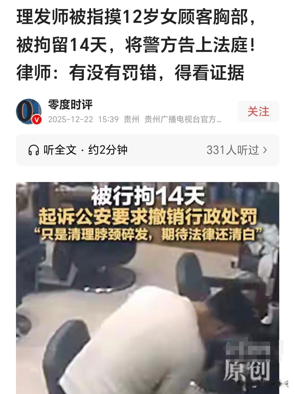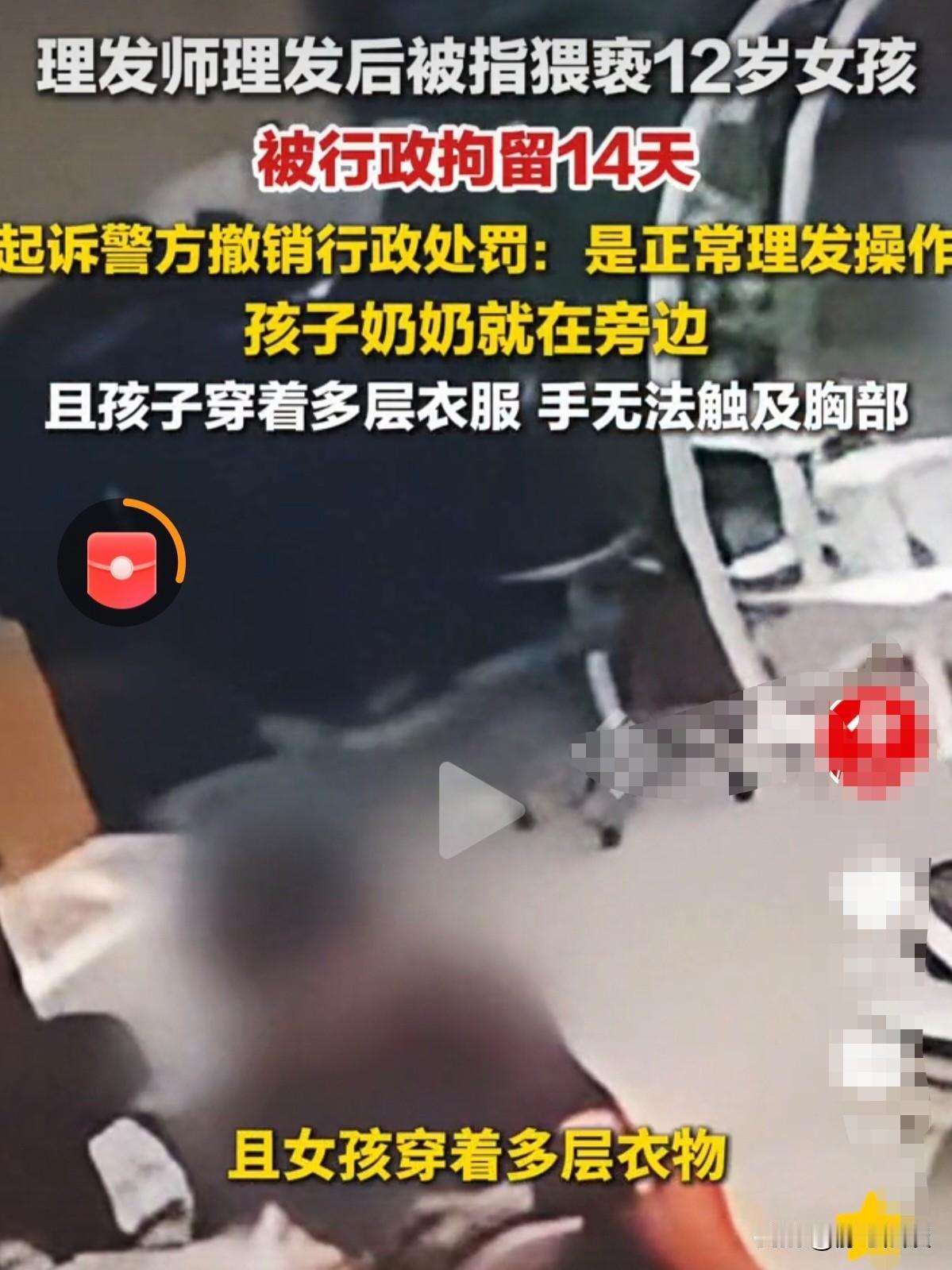 说不清楚了!山东济南,12岁女孩由奶奶领着去理发,回家后说理发师理发过程中,摸她胸部。第2天一早,女孩奶奶又吵又闹找上门来,理发师为了自证清白,当场调出监控。可老太太根本不看,直接报警。警方介入后,理发师依旧否认,但还是被拘留了14天。理发师出来后,越想越憋屈,一纸诉状,将警 方告上法庭。要求撤销处罚! 38岁的吴某怎么也想不到,自己干了快20年的理发手艺,竟会给自己惹这么大的麻烦。 这事发生在2024年10月3号晚上,理发店刚忙完一阵,吴某看看时间不早了,打算差不多就闭店,忙了一天想早点休息。 这时,门口进来一老一小,老太太领着个12岁的小女孩,说是要给孩子剪个短发。 吴某是生意人,对顾客随和热情,都是附近的街坊邻居,虽然不知道姓啥叫啥,但见面都脸熟。 他笑着招呼老太太坐下,让小女孩坐在理发椅上。理发的空档,他还时不时跟旁边的老太太唠几句嗑,逗得老太太眉开眼笑。 吴某手脚麻利,剪刀上下翻飞,没一会儿就剪好了,按老规矩,吴某拿过毛巾,帮小女孩清理脖颈处的碎头发。 他怕碎发扎到孩子,特意仔细清理一番,老太太连声道谢,可那小姑娘却坐在椅子上没动静。 吴某看小女孩没动,还开玩笑说:怎么,不愿意走吗?小姑娘这才起身,走到奶奶身边。 老太太付了钱,还让小女孩谢谢叔叔,小女孩没吱声。 吴某一回头,看见小姑娘的外套落在了老太太刚才坐的椅子上,赶紧喊住她们。 小姑娘折返回来,接过衣服,跟着奶奶头也不回地走了。 本以为这就是桩再普通不过的生意,谁知道第2天一大早,昨天那个老太太就冲进了店里。 一进门就指着吴某又吵又闹,说吴某昨天理发的时候,借着清理碎发的由头,摸了她孙女的胸部。 吴某当场就懵了,自己干了快20年理发,从没出过这种事,也丢不起那人。 他赶紧调出昨天的监控,想自证清白。可老太太根本不看,转头就报了警。 警察来了之后,吴某反复辩解,说自己就是正常清理碎发,啥出格的事都没干。 可警方看完监控,脸色却沉了下来。 监控里明明白白显示,吴某清理碎发时,一只手拉开了小姑娘的衣领,另一只手拿着毛巾,在孩子脖颈部一遍遍划拉。 更关键的是,警方对比了吴某的其他服务记录:给男顾客清理碎发,从不上手拉衣领,最多5秒就完事。 给成年女顾客清理,虽然会拉衣领,但时间也就12到24秒。 可给这个12岁小女孩清理时,不仅拉了衣领,还足足用了45秒。 吴某气得直摇头,清理碎发是正常操作,那孩子身材小,碎发不好擦,我才多花了点时间。 干我们这行的,讲究的就是细致,更何况还是老人带着孩子来的,如果糊弄几下就完事,好像不上心糊弄人似的。 他还强调,当时老太太就坐在旁边盯着,自己要是真有啥坏心思,老太太能看不见? 而且那孩子当天穿的是秋衣加卫衣,料子紧身,他的手最多也就碰到肩膀和锁骨附近,根本碰不到胸部。 可一个12的孩子,怎么会无缘无故撒谎,说理发师碰她胸部呢? 警方认定,吴某是趁着和老太太聊天分散注意力,避开视线,借着擦碎发的名义猥 亵了孩子,直接顶格处以14天行政拘留。 吴某在拘留所里是越想越冤,出来之后,他一纸诉状把警 方告上了法庭,要求撤销处罚。 目前,案子两次开庭还没宣判,吴某表示,这事儿已经把他的生活和工作搅得一团糟,就盼着能早一天查个水落石出。 《治安管理处罚法》第44条 :猥 亵他人的,或者在公共场所故意裸露身体,情节恶劣的,处五日以上十日以下拘留;猥 亵智力残疾人、精神病人、不满十四周岁的人或者有其他严重情节的,处十日以上十五日以下拘留。 女孩12岁,属于不满十四周岁的未成年人,因此警方对吴某作出14日行政拘留。 监控显示吴某拉衣领、毛巾伸入衣服内,且清理时长45秒,比其他客群的操作过长,结合女孩陈述,认定其借清理碎发实施猥 亵。 ​ 吴某辩称,是正常服务操作,因孩子身材小、衣服紧身,碎发难清理才延长时间。 且全程有奶奶在场,手部仅触及肩膀与锁骨,未碰胸部,不存在猥亵主观故意与客观行为。 ​ 警 方对吴某的处罚能不能站得住脚,关键就得看证据扎不扎实、事实清不清楚。 一方面得有实锤证据,证明吴某给小女孩清理碎发时,确实把手伸进了对方衣服里。 另一方面也得核实清楚,能不能排除吴某说的够不着小女孩胸部这类说法的可能性。 单看目前的报道,还没法断定吴某这场官司能不能赢。 但有一点得提醒所有理发师同行,给异性顾客服务时,千万得拎清男女界限,做事把握好分寸。 别因为一时疏忽,给自己惹上甩不掉的麻烦,平白毁了口碑又添堵! 对于吴某申述要求撤销处罚这件事,你觉得能成功吗? @静心法谈 学法辨是非,慬法不吃亏。