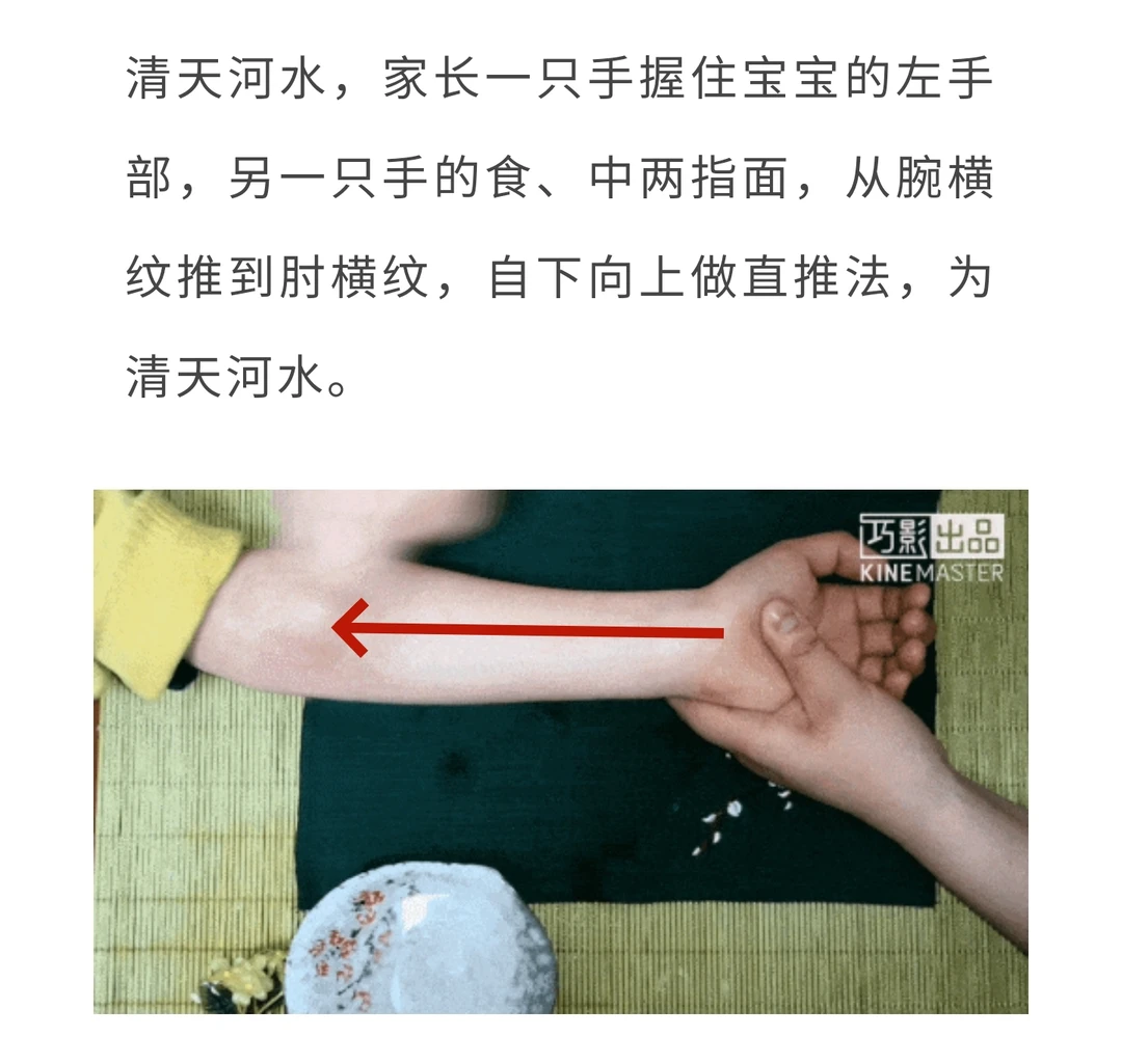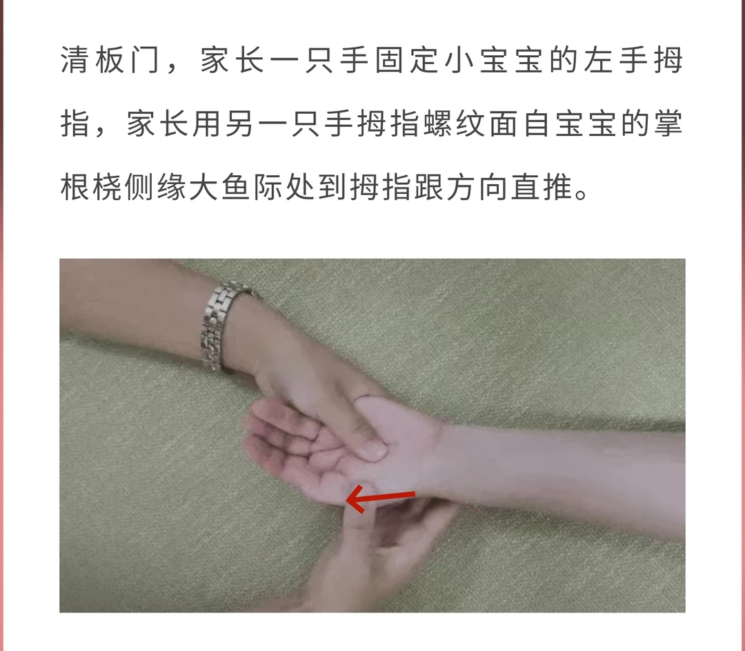 天气逐渐转凉,又到了每年感冒、咳嗽的高发季了,所以我们要提前做好防护,提前增强肺的机能,宣通肺气、扶正祛邪,预防感冒和肺部疾病的发生。 这里给大家推荐一套小儿推拿手法,每天一次,健旺脾气,补足肺气,有助于增强孩子体质,提高抗病能力。 [星R]补脾经——8分钟 操作:家长的一只手握住宝宝的拇指,家长的另一只手用拇指指尖从宝宝拇指桡侧缘,由指尖向指根方向直推,这就是补脾经。 [星R]清板门——5分钟 操作:家长一只手固定小宝宝的左手拇指,家长用另一只手拇指螺纹面自宝宝的掌根桡侧缘大鱼际处到拇指跟方向直推。 [星R]揉外劳宫——5分钟 操作:在手背正中央,第3掌骨中部,用中指按揉。 [星R]揉足三里——5-7次 操作:在犊鼻穴下3寸,胫骨前缘1横指。 [星R]补肾经——5分钟 操作:从小指尖推向指根。 [星R]清肺经——3分钟 操作:家长的一只手固定住宝宝的左手,露出宝宝的无名指,家长用另一只手的食指和中指指腹,沿着宝宝的无名指的指腹面,从指根推向指尖。 [星R]清天河水——1分钟 操作:家长一只手握住宝宝的左手部,另一只手的食、中两指面,从腕横纹推到肘横纹,自下向上做直推法,是清天河水。 这套手法适合体弱多病、病后体虚以及肺炎恢复期和容易感冒咳嗽的的小朋友,大家不放给孩子试试哦!