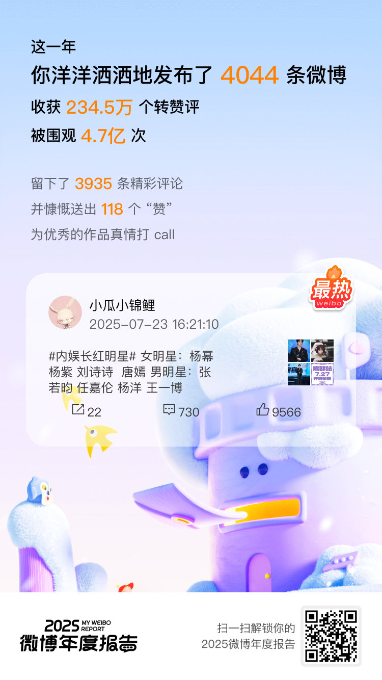 微博年度报告 实力这一块,咱确实拿捏了!2025年稳稳保持 金V身份365天!相逢的意义在于彼此照亮,这份成绩单离不开你们一直以来的支持和陪伴!你的专属年度播报也已生成,速来>>2025微博年度报告 围观!微博之夜