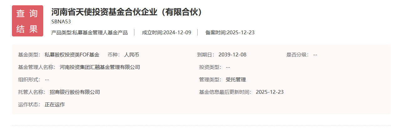 天眼查显示,河南省天使投资基金合伙企业(有限合伙)成立于2024年12月,出资额10亿元,由河南省财政出资,委托河南投资集团发起设立,带动社会资本更多投向河南省种子期、初创期等天使类项目的天使母基金。