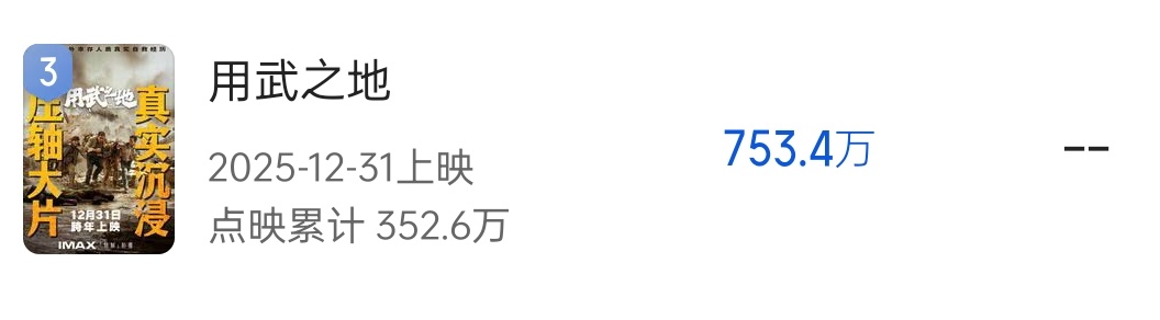 《用武之地》今天的点映黄金场占了21%,非常夸张不过票房不理想,昨天预测今天是7