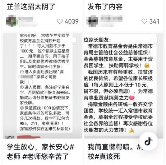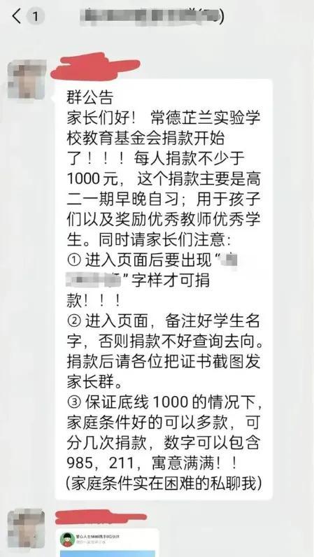“自愿捐款,建议1000元起步?”​ 这两天,湖南常德芷兰实验学校的一场募捐风波,让不少家长心里堵得慌。 原来,有家长群发出通知,明确要求给学校教育基金会捐款每人不少于1000元,甚至暗示金额可带985,211图个好彩头。可一被曝光,学校方面却迅速回应!这是家委会自发行为,我们强调自愿。这波操作,难免让人感觉是让家委会“顶包”。 好在常德教育局没和稀泥,24日果断通报。部分班级在宣传中违背自愿原则,设定额度,属实违规!​ 现已责令暂停活动,清退款项,并要严肃追责。不得不说,这次处理速度值得点赞! 这事儿也戳中了一个痛点!家委会本应是家校沟通的桥梁,但有时却成了某些“不便明说”的收费渠道。表面“自愿”,实则让家长陷入不捐怕孩子吃亏的焦虑。教育是净土,别让爱心绑上功利秤砣。