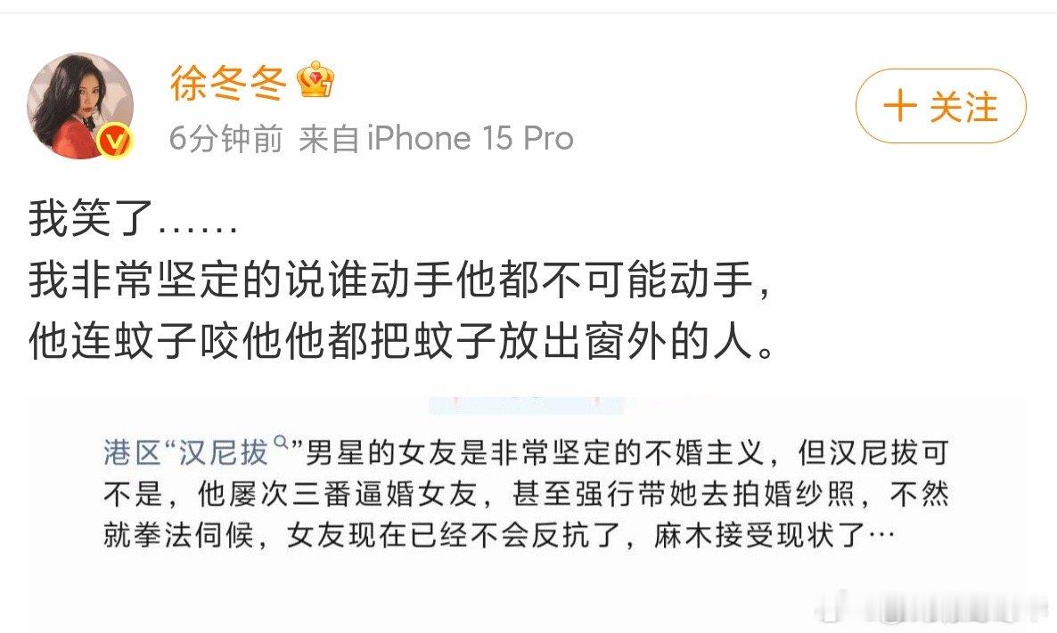 徐冬冬辟谣尹子维逼婚 港区男神尹子维被传逼婚徐冬冬?当事人火速出面澄清,坦言对方性格温柔至极,连蚊虫都会善待。不实传言别轻信,祝福二人甜蜜相伴就够啦!