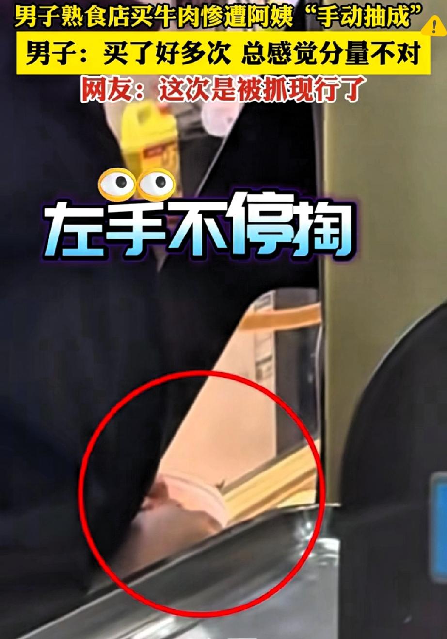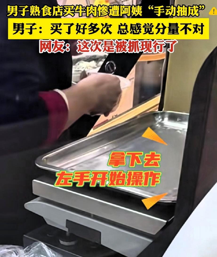 江苏男子买卤牛肉遇猫腻,称重后店员竟熟练偷肉,这操作良心不会痛吗? 男子头天买肉就觉分量不对,第二天带手机录像蹲守,果然抓个正着:店员称完肉转身打包时,飞快捏出两块塞进旁边容器,动作娴熟得像练过千百遍。 这种偷偷摸摸的伎俩,不光是缺斤少两坑钱,徒手抓肉的卫生问题更让人膈应。 别把消费者当傻子,也别把小聪明当本事。 连锁卤味店靠的就是口碑,称重打包这点基本规矩都守不住,耍这种下三滥手段,看似赚了点小钱,实则砸了自家招牌。 监管部门严查是必须的,毕竟消费者的权益,容不得半点糊弄。 你遇到过这种缺斤少两的糟心事吗?