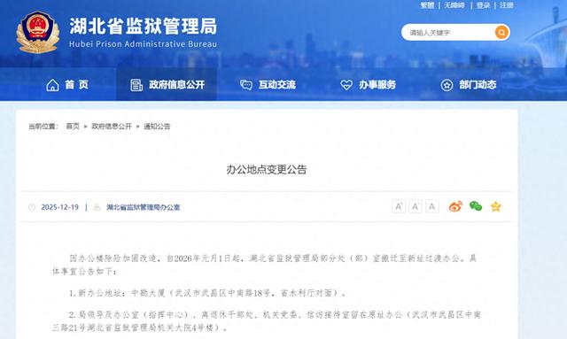 12日19日,湖北省监狱管理局办公室发布办公地点变更公告,因办公楼除险加固改造,自2026年元月1日起,湖北省监狱管理局部分处(部)室搬迁至新址过渡办公,新办公地址位于中勘大厦(武汉市武昌区中南路18号,省水利厅对面),局领导及办公室(指挥中心)、离退休干部处、机关党委、信访接待室留在原址办公(武汉市武昌区中南三路21号湖北省监狱管理局机关大院4号楼)。