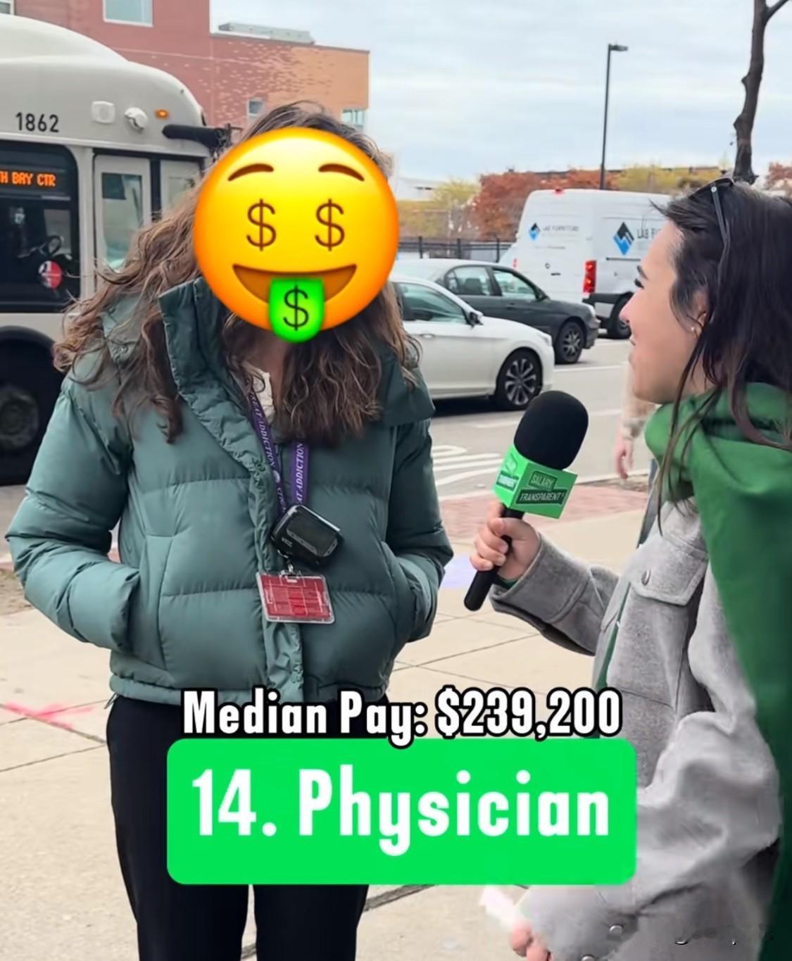美国医生护士是真赚钱。美国街头采访了医生护士的收入。麻醉师的平均收入高达33万美元。放射科医生收入是35万美元…… 美国这个街头采访很火,会给出每个行业的平均工资,然后再采访路人,看路人工资与行业平均工资的差距有多少。大多数路人的回答,居然与平均工资差距不大。 例如,护士平均工资是12.6万美元。采访到的一名护士说她收入是12万美元,然后说“挣得不够”。 总体来说,美国医生收入确实像电影里说的,是高薪职业。像内科医生收入23万美元,麻醉师33万美元,放射医师35万美元,心理医生25万美元。 护士与药剂师的收入相对少,药剂师收入13万美元,麻醉科护士收入更高能到21万美元,其他护士在8万美元至13万美元。 也有一些路人收入与行业平均工资差距较大。例如一名路人说自己是心理医生,收入仅8万美元,但行业平均工资是25万美元。美国网友解释说,这可能因为他是住院医生阶段,所以收入较低。