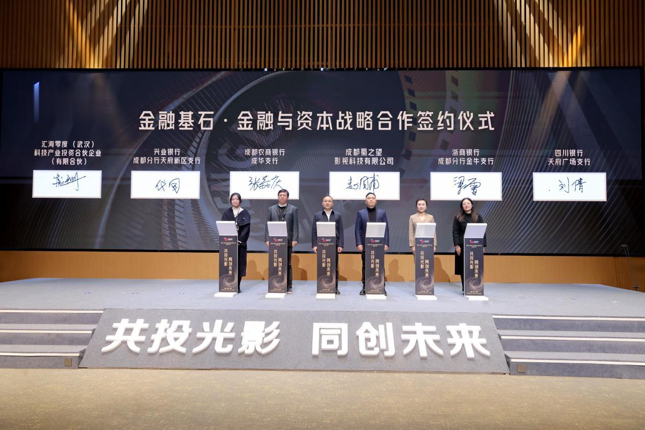 成都蜀之望影视科技有限公司与成都农商银行成华支行、浙商银行成都分行金牛支行、兴业银行成都分行天府新区支行、四川银行天府广场支行、汇海零度等5家金融机构达成战略合作,致力于为影视项目提供覆盖开发、制作、宣发等环节的全周期金融支持和资本解决方案。成都市作家协会、浙江吾知视界科技有限公司、成都梦蓝方舟科技有限责任公司的签约合作,则开启了“电影+文学”“电影+科技”“电影+文旅”等多元融合发展的新路径。