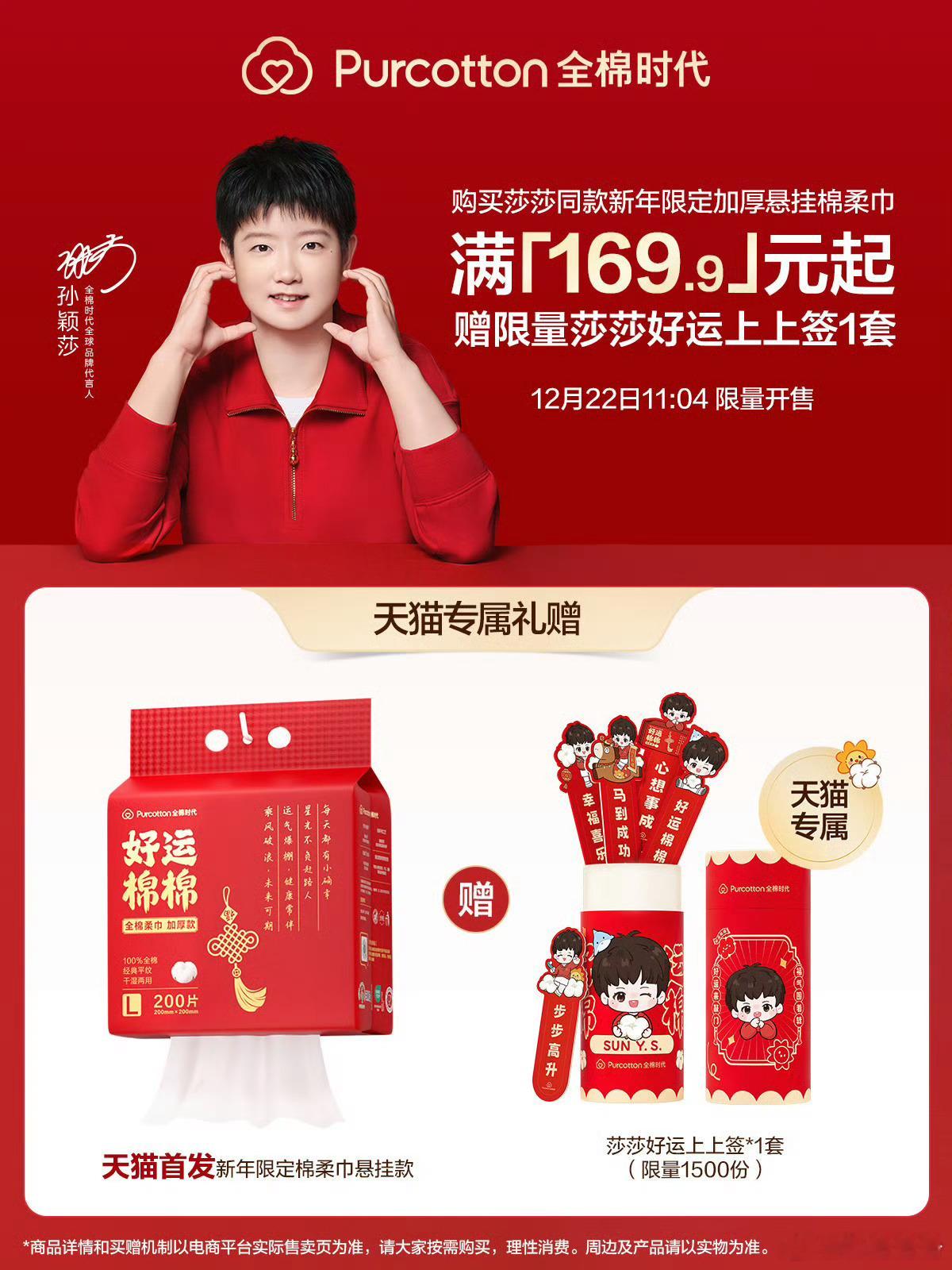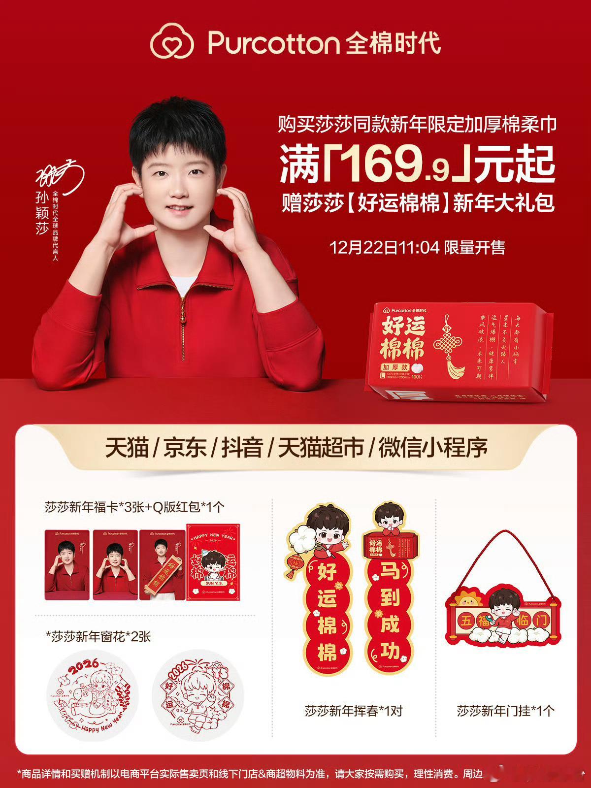 每一代都有全棉时代和全棉时代孙颖莎一起好运棉棉 还在为新年送礼不知送什么好吗,快来看看这个莎莎代言的全棉时代新年限定加厚款【好运棉棉】大礼包吧。 全棉时代柔巾,选用100%的精选好棉,加厚33%,更柔45%,0添加,不刺激,洗脸卸妆、居家清洁、宝宝擦脸,全家都可以使用。 选用全棉时代,就是把安全放心带回家,更有莎莎新年定制周边送,让你好运棉棉一整年。