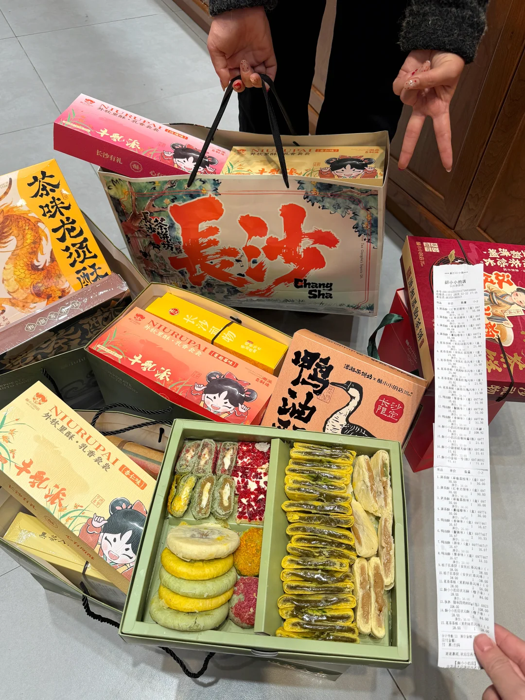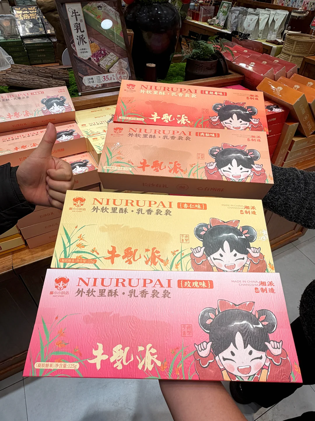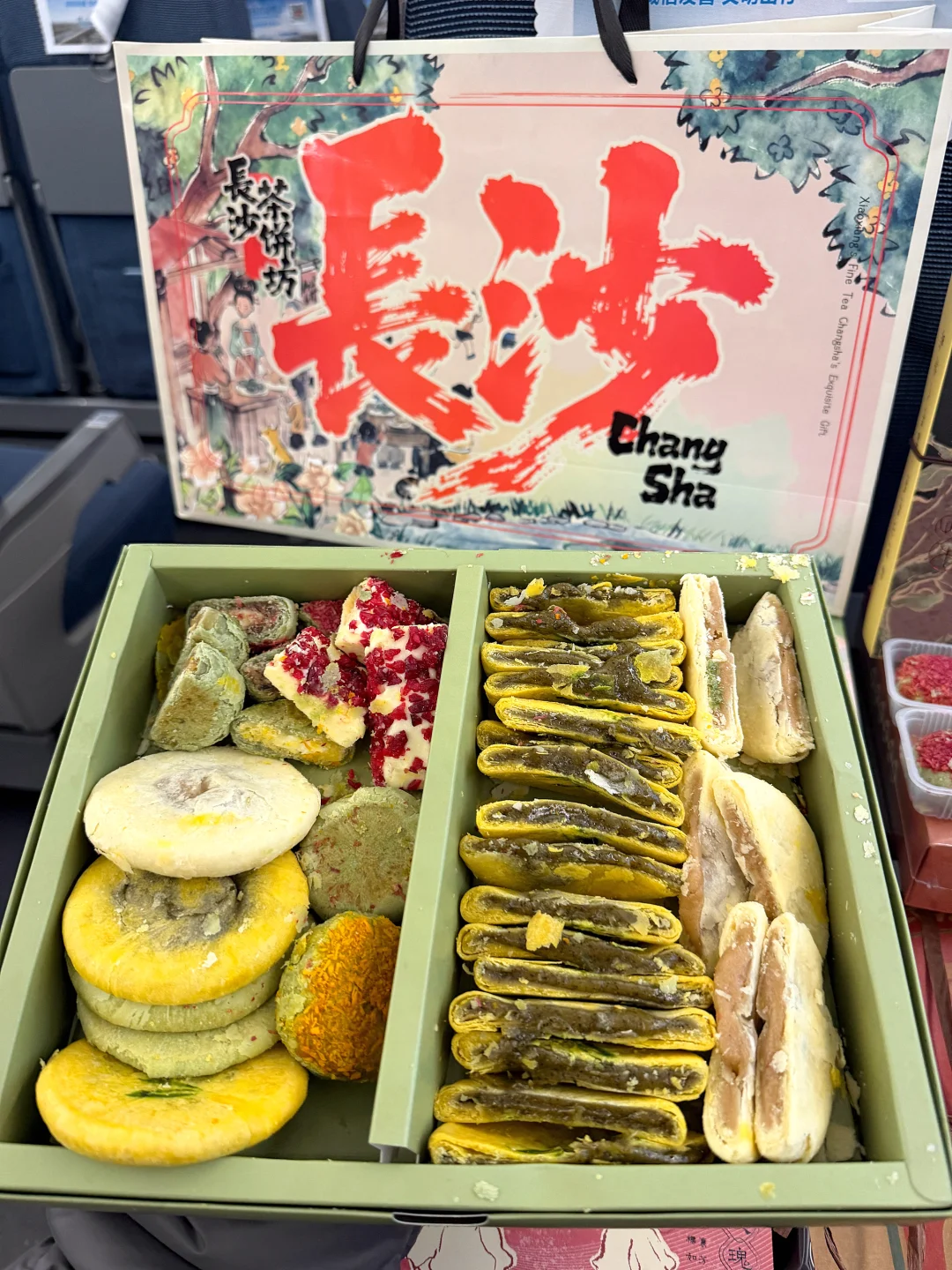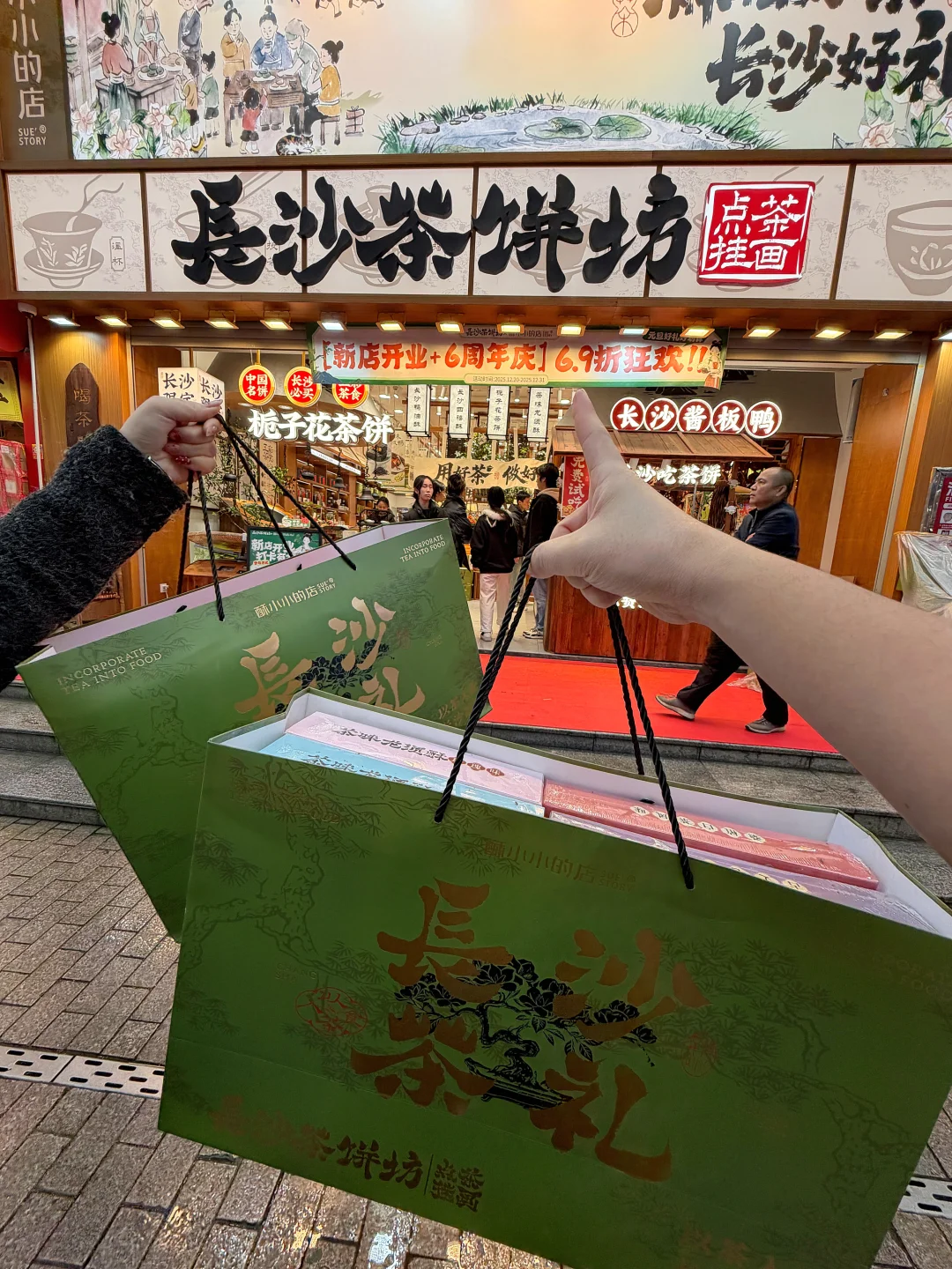 黄兴广场太多美食了…本地人带路才找到的特色茶饼!真心觉得不错!买了好多袋!明码标价好便宜!黑茶酥、茉莉绿茶、鸭油酥、牛乳派…正宗长沙特色茶点,还有茶香酱板鸭、辣度可以选择,很香很有嚼劲…!!建议来长沙旅游的姐妹们打卡(酥小小的店·长沙茶饼坊)这家!