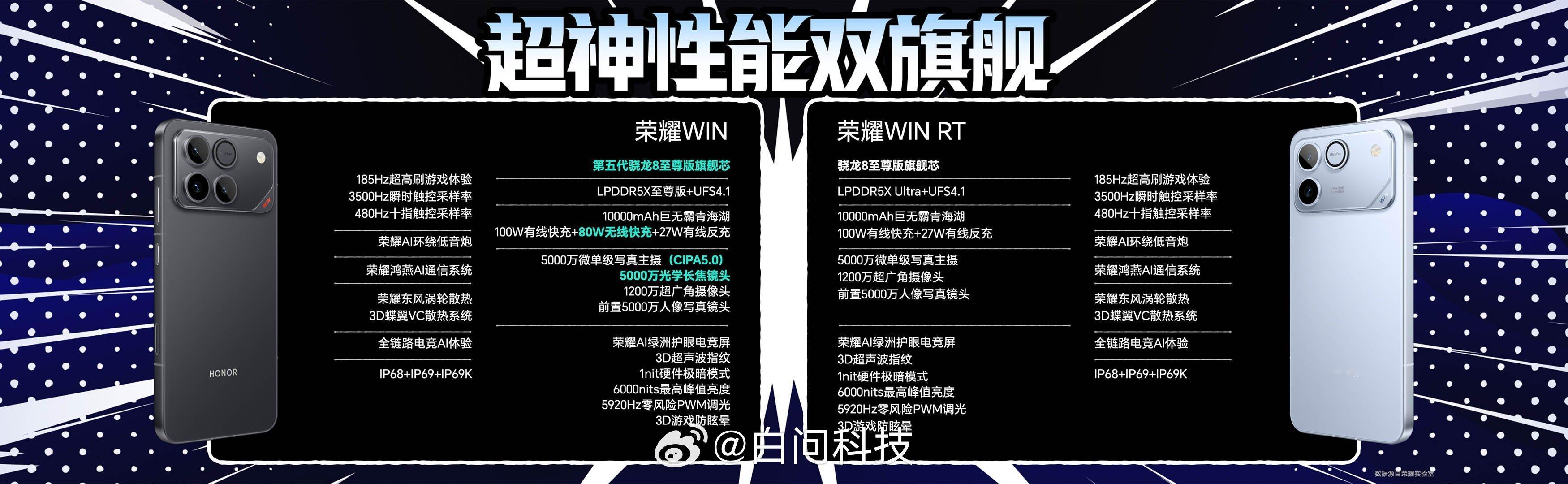 荣耀 WIN和 WIN RT主要区别在于处理器、无线快充、主摄CIPA 5.0 防抖无线充和长焦镜头上,其他配置不变,大家会选哪台?荣耀发布会