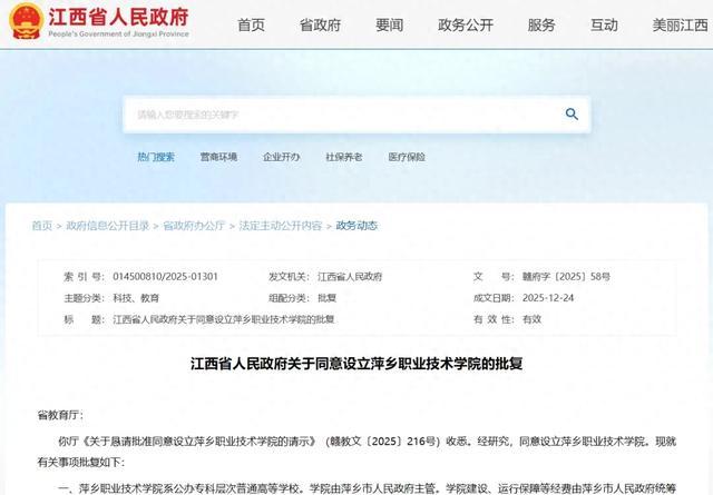 你厅《关于恳请批准同意设立萍乡职业技术学院的请示》(赣教文〔2025〕216号)收悉。经研究,同意设立萍乡职业技术学院。现就有关事项批复如下: