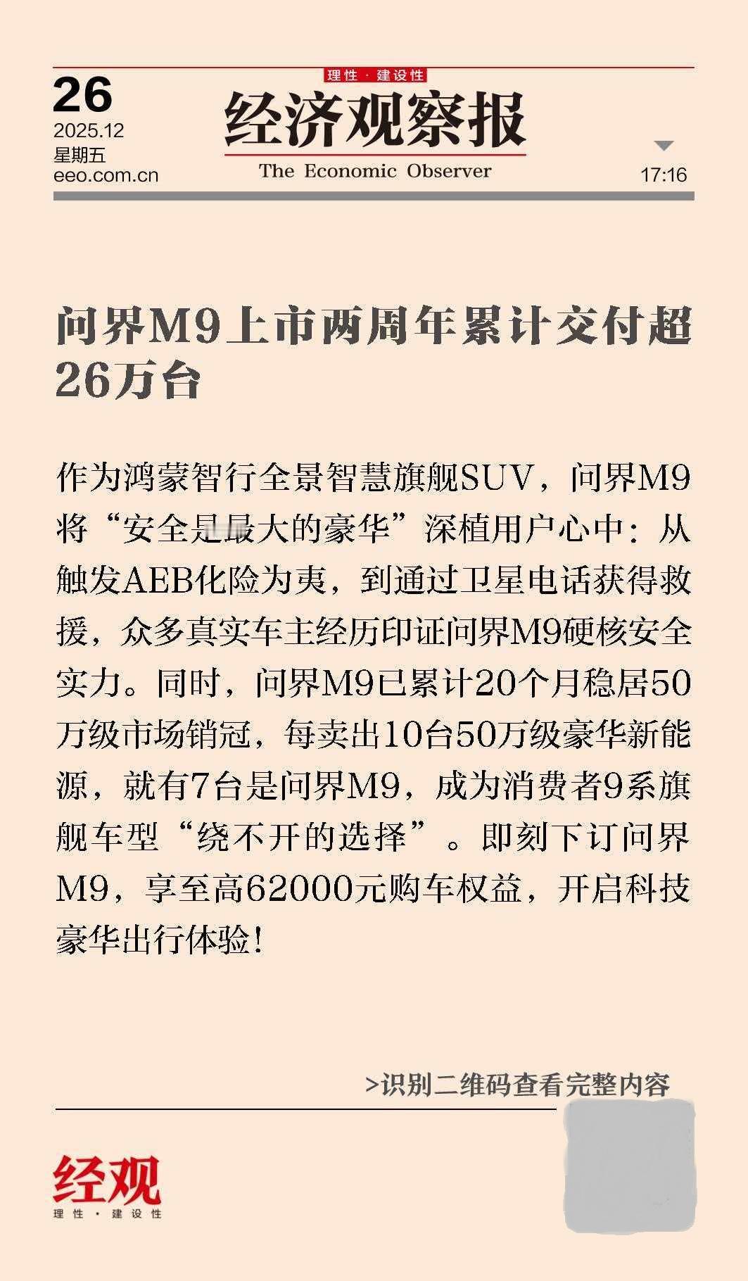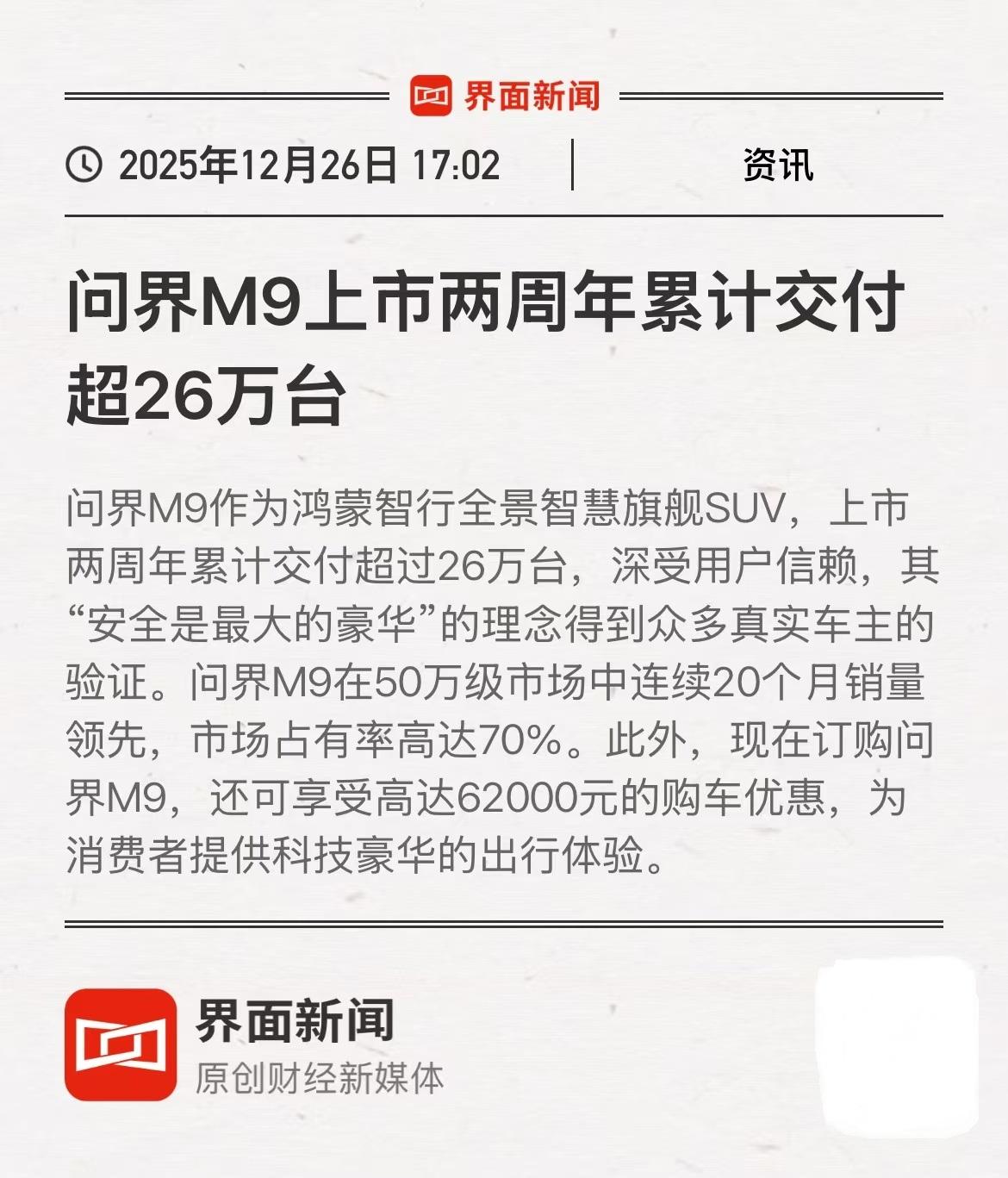 问界M9两周年加冕三冠王,立起中国豪华车新高度 问界M9上市两周年交出亮眼答卷,累计交付超26万台的成绩,坐稳50万级豪华新能源市场销量榜首。其两周年视频“一路同心,星程共耀“”,更是勾勒出中国品牌高端化的进阶轨迹。 高净值圈层对这款车型的认可持续攀升,每卖出5台车便有2台来自用户推荐,口碑裂变的背后,是产品实力与圈层共鸣的深度契合。华为全栈智能化技术筑牢硬核基底,玄武车身守护极致安全,卫星电话救援功能拓宽出行边界,持续OTA升级实现用车体验常用常新。多重技术优势叠加,让问界M9斩获双权威保值率第一,达成销量、口碑、保值率三冠加冕。这款车型的突围,打破了高端豪华车市场的固有格局,重塑50万级赛道价值标杆。更以科技豪华的全新表达,推动中国品牌在高端市场实现从技术突围到文化自信的跨越,成为中国智能豪华汽车向上的标杆范本。