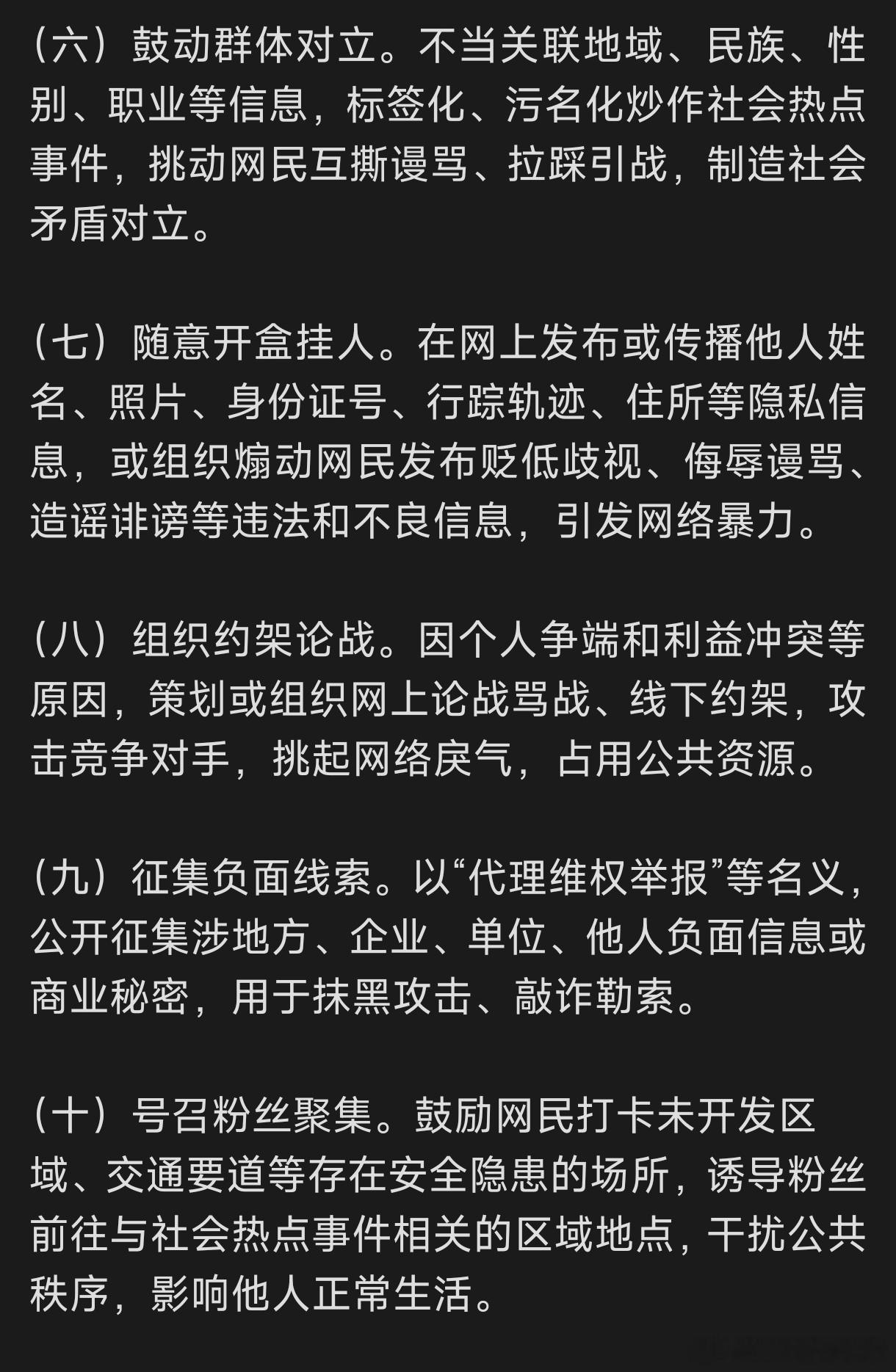网络名人账号行为负面清单Checklist来了(六)鼓动群体对立。不当关联地域、民族、性别、职业等信息,标签化、污名化炒作社会热点事件,挑动网民互撕谩骂、拉踩引战,制造社会矛盾对立。