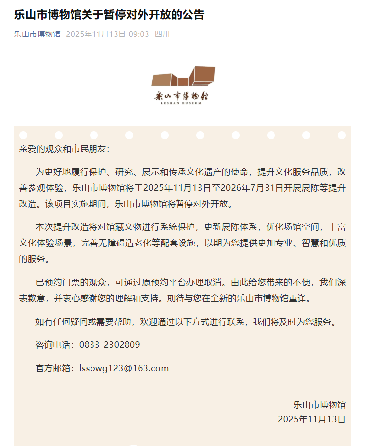 乐山市博物馆于2025年11月13日至2026年7月31日开展展陈等提升改造,其间将暂停对外开放。