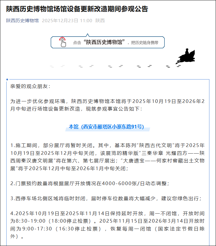 陕西历史博物馆本馆将于2025年10月19日至2026年2月中旬进行场馆设备更新改造,期间部分展厅将暂时关闭。同时,陕西历史博物馆本馆“唐代壁画珍品展”以及“壁上丹青盛唐气象——唐韩休墓壁画考古发掘与保护展”将于2025年11月3日起暂时关闭,恢复开放时间将另行公告。