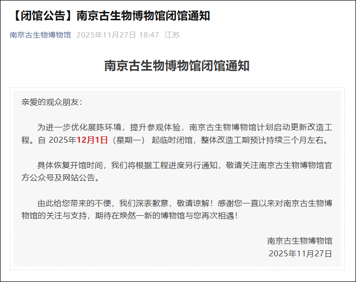 南京古生物博物馆计划启动更新改造工程,自2025年12月1日(星期一)起临时闭馆,整体改造工期预计持续三个月左右。