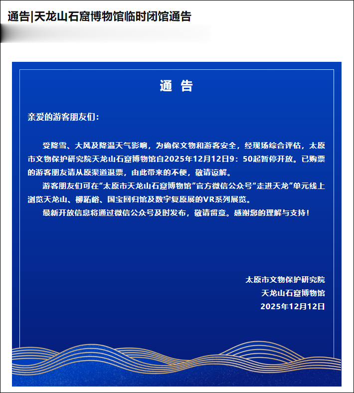 受降雪、大风及降温天气影响,为确保文物和游客安全,经现场综合评估,太原市文物保护研究院天龙山石窟博物馆自2025年12月12日9:50起暂停开放。