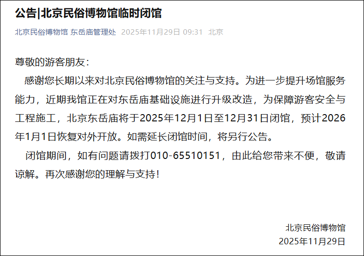 北京民俗博物馆东岳庙于2025年12月1日至12月31日闭馆,预计2026年1月1日恢复对外开放,如需延长闭馆时间,将另行公告。