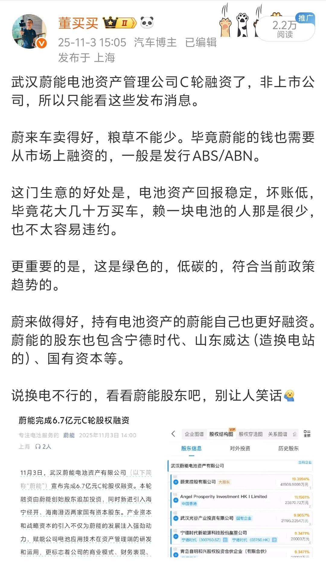 蔚能C轮又增加了国有资本,据上一次好消息时隔仅一个月。随着换电被越来越多车主使用,不能换电的弊端暴露,蔚能和蔚来都会愈发值钱。百万车主,蔚能服务超过50万。