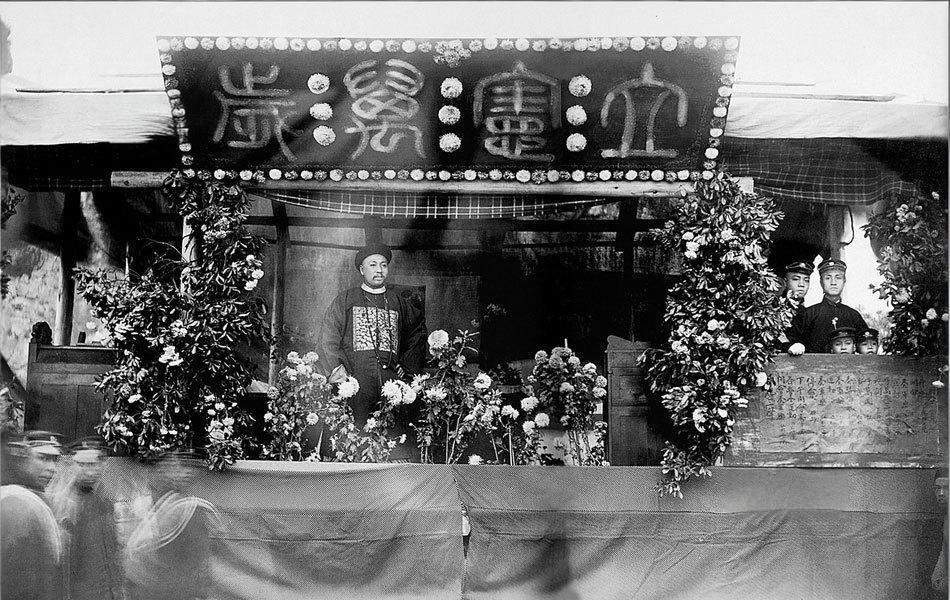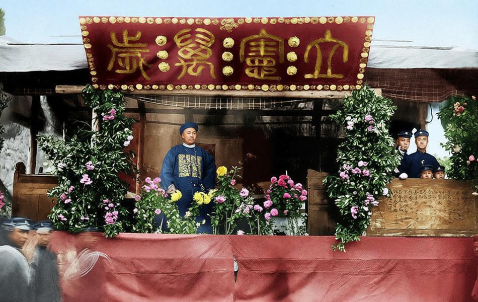 这张照片拍摄于清末,广西桂林举行的官方庆祝“预备立宪”集会现场。主席台上方醒目横额书写“立宪万岁”四个大字,两侧装饰菊花和常青植物,台上中央站立一穿清官员,右台前布置花坛,整体氛围隆重而喜庆。 上谕颁布后,全国掀起“立宪热”,广西响应稍晚,1906年11月25日,广西学务处饬令桂林各学堂师生3000余人,在文昌门外简易师范学堂举行庆祝立宪大会。巡抚林绍年、布政使张鸣岐等文武官员莅临,登台演说,宣读上谕后全体欢呼“立宪万岁”。