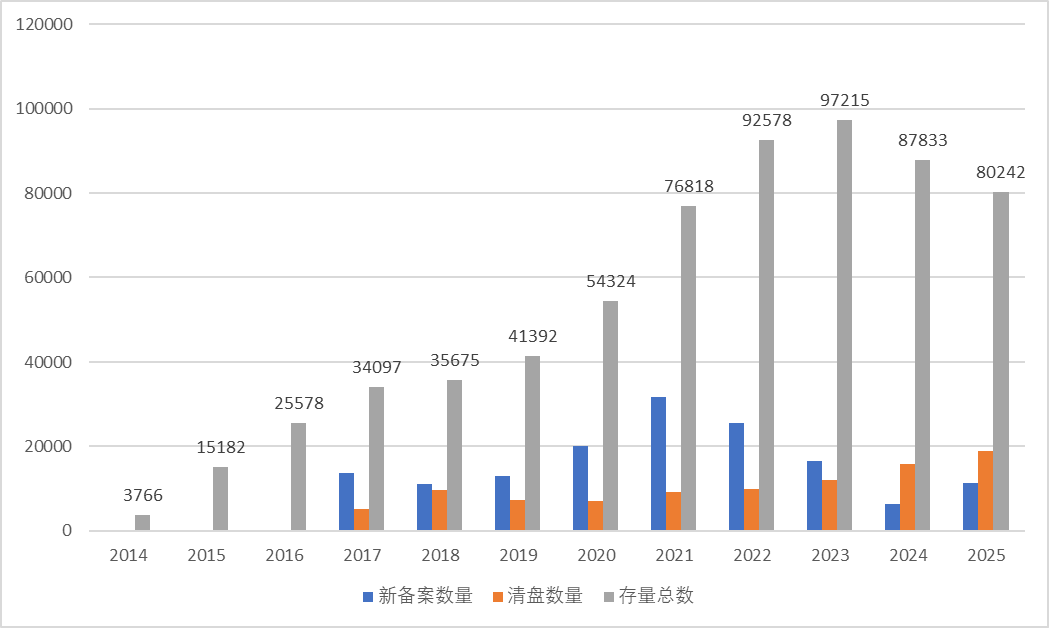 由于相关数据缺失,2014年-2016年不展示新备案数量和清盘数量
