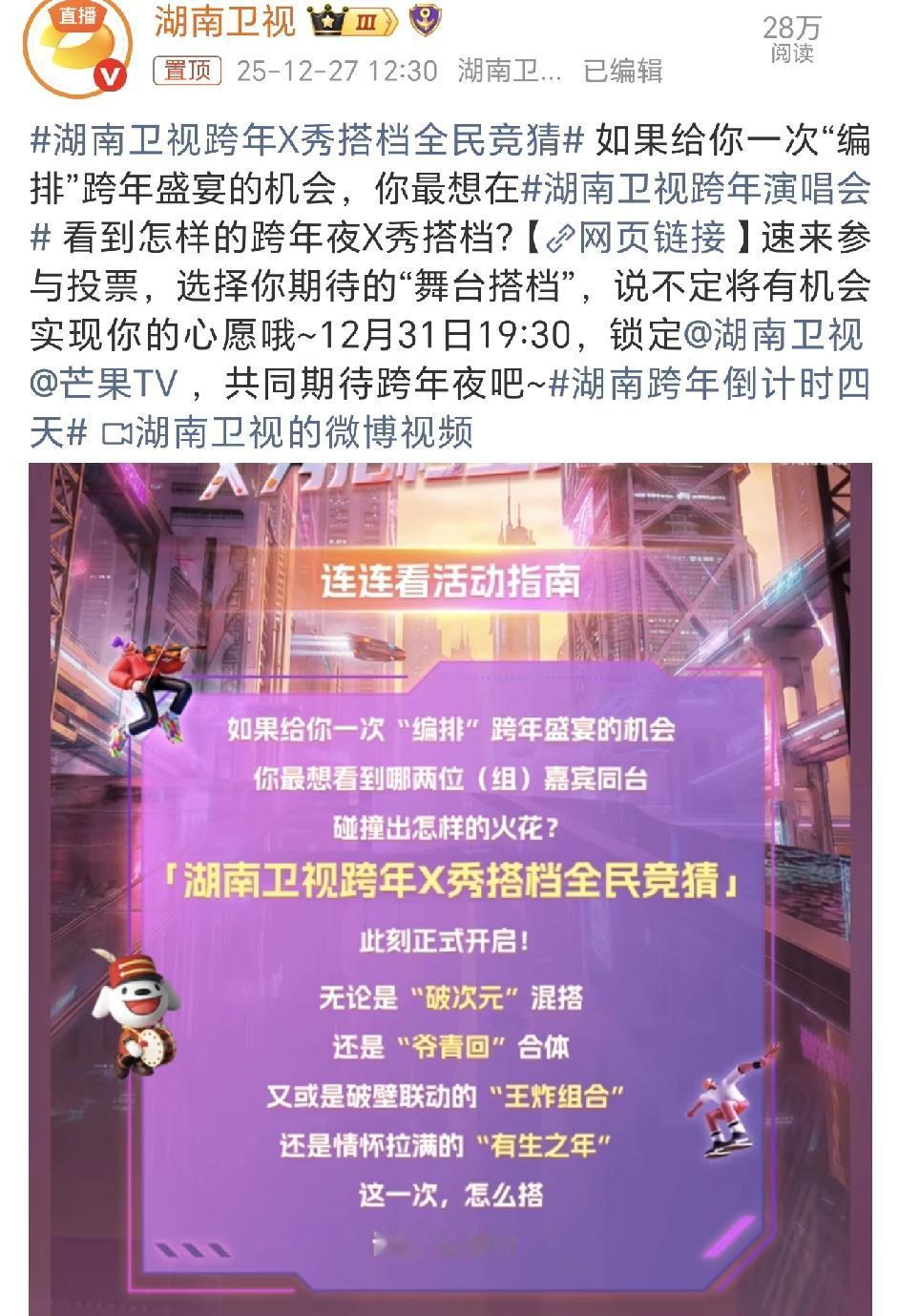 湖南卫视跨年晚会又出新花样了! 跨年晚会X秀搭档全民竞猜, 你最想看怎样的跨年夜X秀搭档? 我选了三对, 陈楚生和徐佳莹,我就是单纯觉得他们俩的气质特别般配,之前两个人合唱的《身骑白马》非常好,仿佛薛平贵和王宝钏穿越而来,两个人又都跟闽南有着千丝万缕的渊源,好希望他们能再合作! 苏醒和王心凌,王心凌曾经作为嘉宾来过快乐老友记,在兄弟们眼里是神仙姐姐,这次希望苏醒跟王心凌能有合作的机会,看看冠亚和神仙姐姐的合作有什么不一样[捂脸]! 最后一对我选了那英和窦靖童[大笑],那英和王菲是闺蜜,现在二代都来了,能不能同台呢,非常喜欢窦靖童的性格,青出于蓝胜于蓝,希望听到她更多的歌!陈楚生 苏醒 跨年晚会 那英
