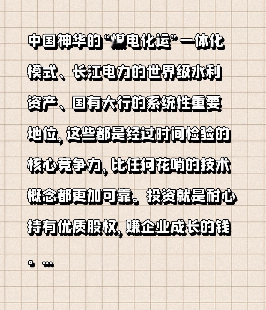 中国神华的“煤电化运”一体化模式、长江电力的世界级水利资产、国有大行的系统性重要地位,这些都是经过时间检验的核心竞争力,比任何花哨的技术概念都更加可靠。 投资就是耐心持有优质股权,赚企业成长的钱。成长的钱包括分红、股价上涨等等,但最重要还是稳定的分红,这比任何涨停板都更让人动心。