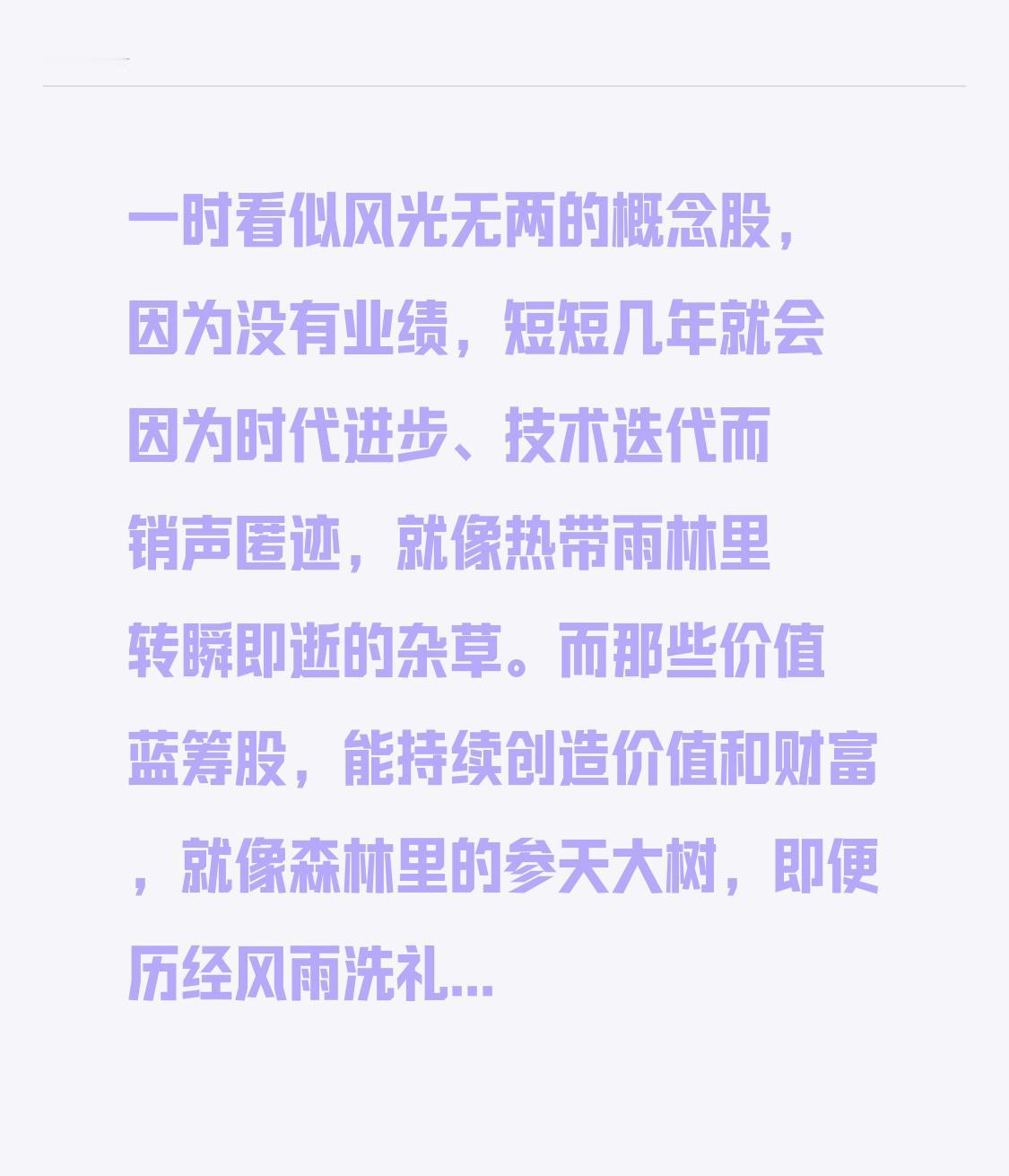 一时看似风光无两的概念股、妖股,因为没有交易、没有业绩,短短几年就会因为时代进步、技术迭代而销声匿迹,就像热带雨林里转瞬即逝的杂草。 而那些价值蓝筹股,在各自领域里深耕,能持续创造价值和财富,就像森林里的参天大树,即便历经风雨洗礼,依然能枝繁叶茂。