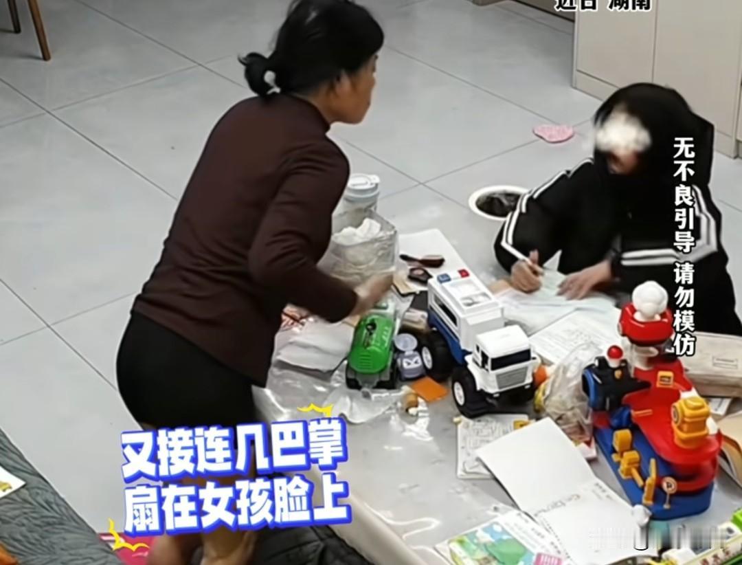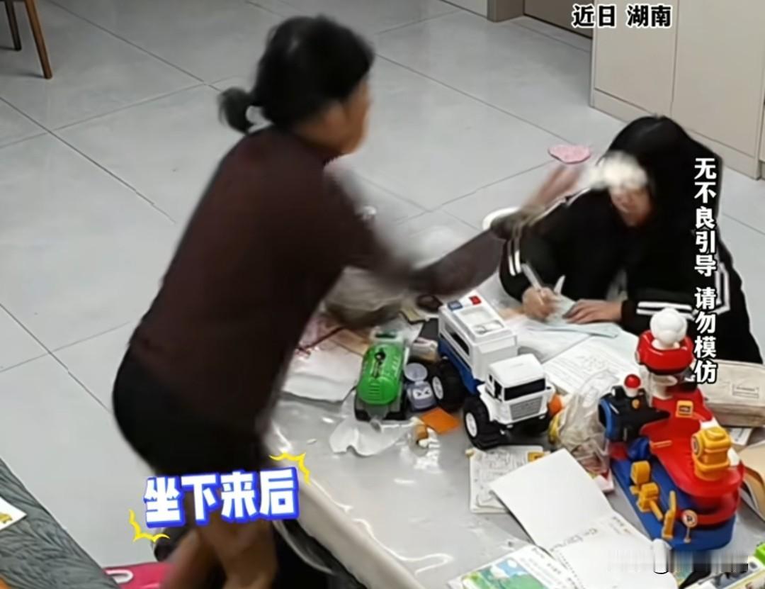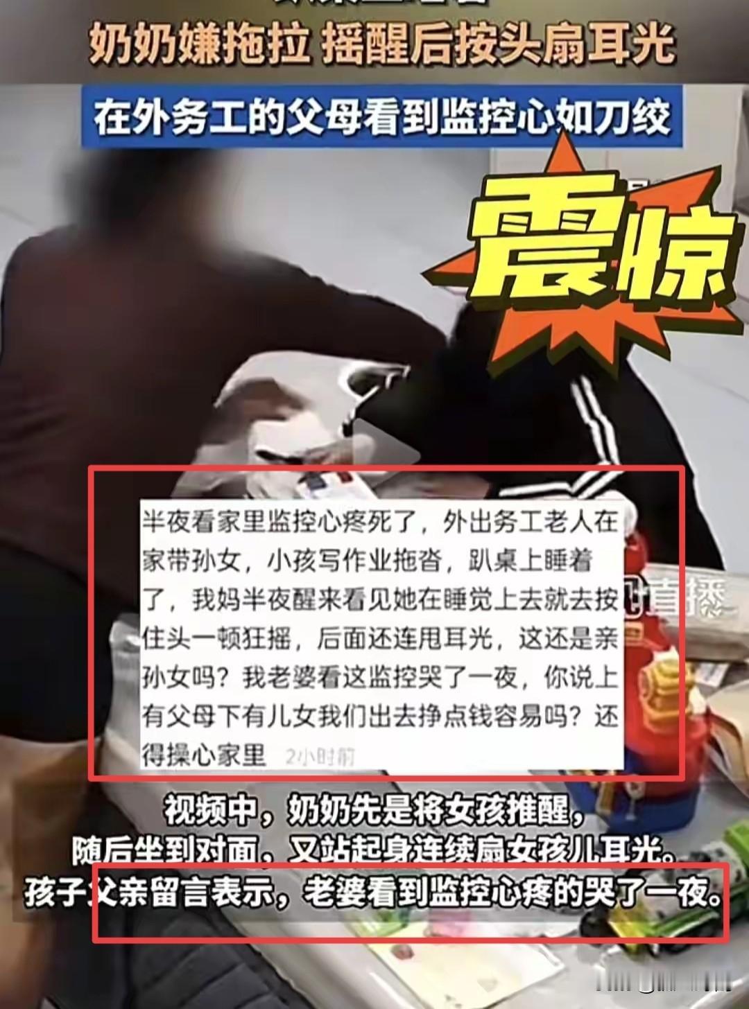 奶奶狂扇孙女7次全程曝光,嘴肿出血仍不敢哭,父亲发声痛斥: “这还是亲孙女吗?” 12月25日,湖南,7岁小雅因为写作业不知不觉的趴在客厅桌子上睡着了,直到凌晨1点钟,小雅奶奶起床时发现客厅的灯还亮着走出去一看,孙女趴在桌子上睡着了,火气一下就上来了,先去将客厅的灯关上,然后去推搡正在熟睡中的小雅,而小雅醒来的第一时间就是去写作业,发现客厅的灯被关了,于是起身去将灯打开,继续写作业。这个时候奶奶才发现小雅的作业竟然还没有写完,于是对小雅一顿批评,不知道小雅跟奶奶说了什么,彻底惹怒了老人。 只见视频中显示,老人起床并没有穿裤子,双腿上贴满了药膏,站起来就去扇孙女的嘴巴,短短5分钟时间,扇了孙女7巴掌,其中一个细节更令人痛心,那就是小雅被奶奶打不敢反抗,不敢吭声,哪怕哭也是小声抽泣,脑袋都低到桌面上了,却被奶奶双手扯头发给扯了起来,再次被奶奶连扇了好几巴掌。 因此,在外地工作的小雅父母看到这段监控视频后,当场崩溃,尤其是小雅的妈妈,哭了一晚上睡不着觉。 而小雅的爸爸更是将这段视频曝光在网络上,发声痛斥自己的母亲: “这还是亲孙女吗?就因为孩子写作业拖沓就被连扇耳光?你说上有父母下有儿女我们出去挣点钱容易吗?还得操心家里。” 其实,造成这种局面的,不只是视频中狂扇孙女巴掌的奶奶,还有小雅的父母,社会的求生形态等等。 如果不是生活所迫,谁愿意将孩子留在乡下,让孩子当个留守儿童。 小雅的父亲将监控曝光,估计想让自己的母亲收敛点吧,有网友说: “所以呢,爹妈该怎么做?办法总比困难多!” 也有网友说: “说实话,没接走还放在家里,那就不要假装心疼,因为也对不起孩子,发出来是让自己愧疚的心好受吗?” 希望,小雅的父母能够跟老人好好谈一谈,也希望小雅能够勇敢点,被伤害了第一时间告诉自己的爸爸妈妈,别一个人默默承受,这次,要不是父母突然查看监控,估计这一次白挨打了!