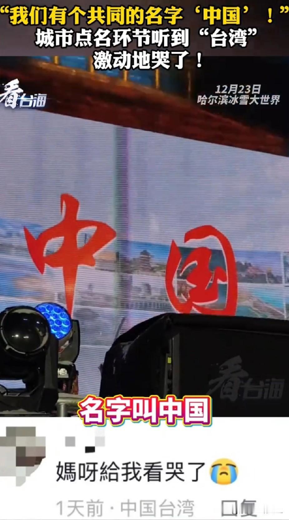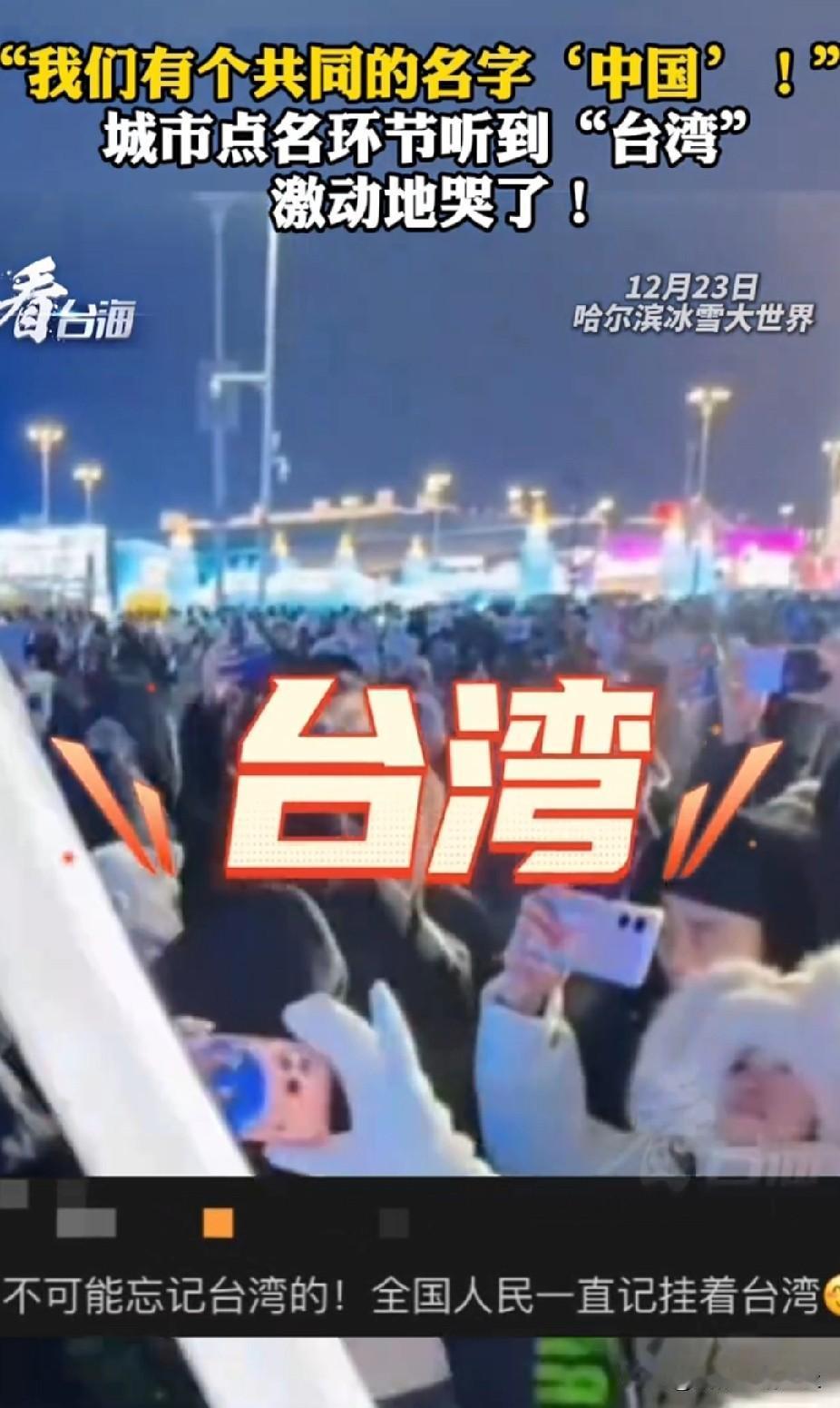 “台湾同胞全哭了”!近日,有台湾同胞去哈尔滨冰雪大世界玩,听见主持人高声大喊:欢迎全国的朋友们时,她以为把“台湾忘了”,结果破防了! 台湾从古至今,都是中国的地盘,早已深深地刻在了国人的DNA里! 最近的哈尔滨冰雪大世界,真热闹啊! 尽管北风裹着雪花呼呼地刮,可冰天雪地园区仍然人山人海,个个都热情高涨玩得不亦乐乎。 在互动舞台上,主持人的大嗓门一喊,瞬间就让全场的气氛燃爆了。 其中最重要的一个环节是,主持人会挨着点出地名,欢迎来自全国天南海北的游客们。 刚才还在吵吵嚷嚷的人群,突然安静了起来,个个都缩着脖子,等着听自己家乡的名字,想在这片冰天雪地里响亮地喊出来。 “欢迎广西的朋友!” 主持人话刚一落音,台下立马像炸了锅,欢呼声震耳欲聋。 接着,主持人又喊出,“福建!”, “广东!”,“香港!”,“澳门”…… 每喊出一个地名,那个地方的游客就会立马大声回应,把现场的气氛掀得一次比一次火热。 人群里,有位来自台湾的同胞,也跟着大伙儿边拍手边笑,眼睛一眨不眨地盯着主持人,心里的期待都快溢出来了。 要是在这么热闹的场合里,能听到“台湾”这俩字被郑重其事地喊出来,那股从心底里冒出来的归属感,光是想想心里就暖洋洋的。 可谁知道,主持人喊完“澳门”这两个字之后,突然话锋一转,居然开始说起接下来的活动流程。 台湾同胞脸上的笑容,“唰”地一下就僵住了,好像被人兜头泼了一盆凉水,瞬间就凉了半截。 心里酸溜溜的,一下连抬手鼓掌的劲都没了。 就在这时候,主持人突然猛地提高了音量:“还有我们的——台湾!” “台湾”这两个字刚一落地,全场的观众就跟提前约好过似的,齐刷刷地挺直了腰板齐声高喊:“台湾!” 那声音又亮又齐,让人心里一阵一阵地发热。 台湾同胞的眼眶,在那一瞬间红了,泪水忍不住快流出来了。 她站在人群里,跟着大家一块儿红着眼眶欢呼,虽然流着泪,可嘴角却忍不住上扬着。 紧接着,主持人的声音再次响了起来,字字铿锵,掷地有声,在冰雪大世界的上空久久地回荡着。 “此时此刻,我们有一个共同的名字,他的名字叫中国!” 这位台湾同胞再也忍不住了,赶紧伸出手捂住嘴,蹲在地上破防了! 有网友说:这眼泪里,有感动、有骄傲,更有一份刻在骨子里,融进血脉里,这辈子都割舍不掉的家国情怀。 还记得《郑成功收复台湾》吗?1961年4月,郑成功率2.4万官兵,从荷兰手中收复台湾。 不管隔着多少千山万水,不管身在海角天涯,我们永远都和台湾同胞是一家人。 这是刻在基因里的深情,经得起岁月的洗礼,扛得住风雨的考验。 对于犯我中华者,虽远必诛!