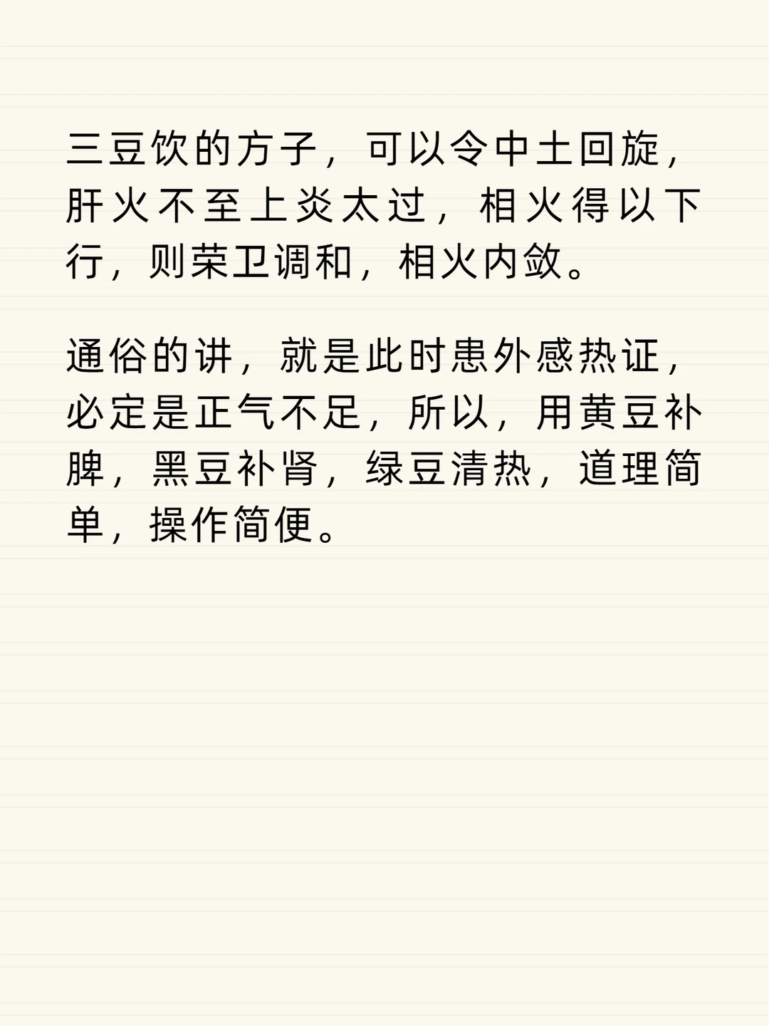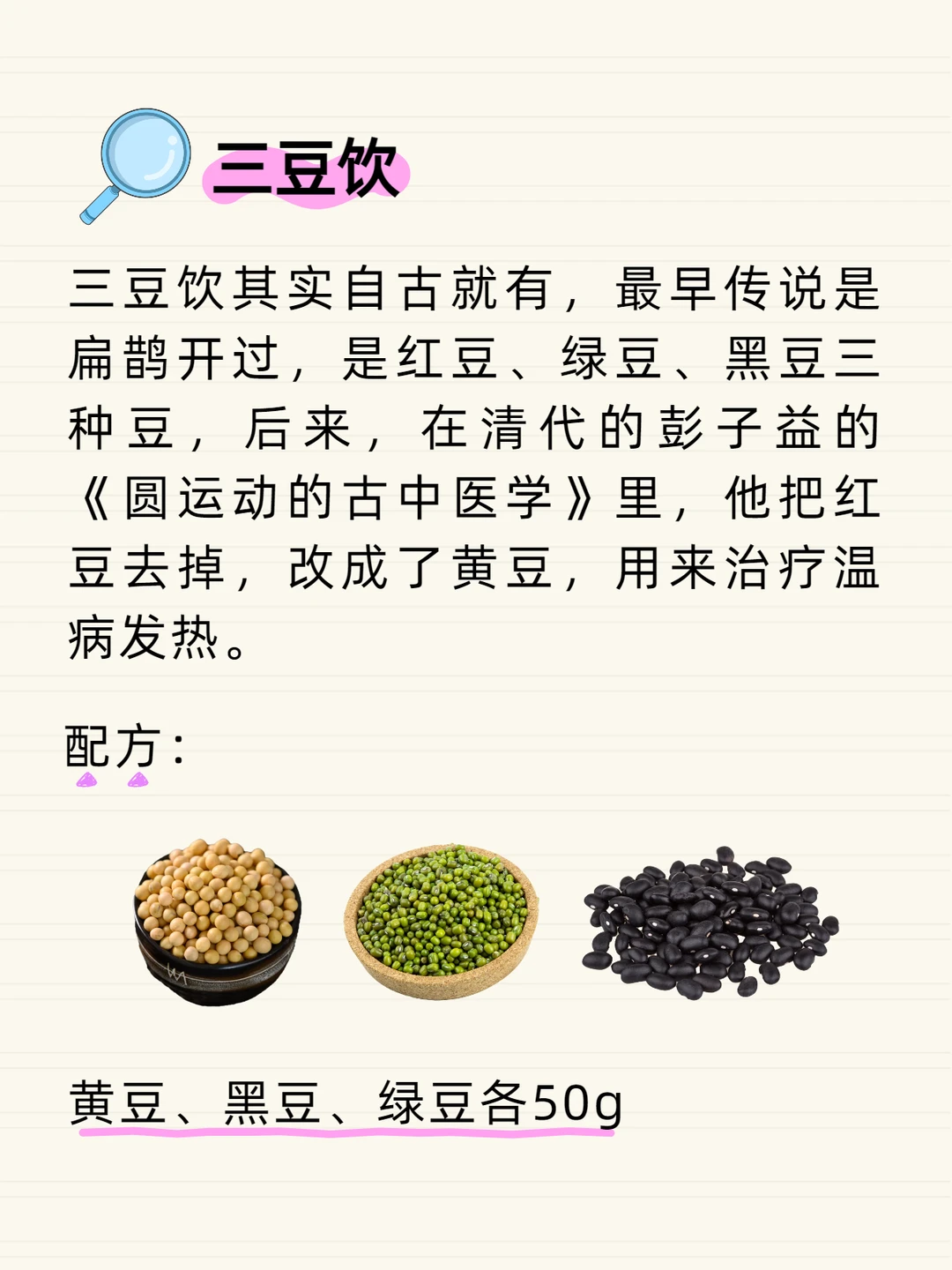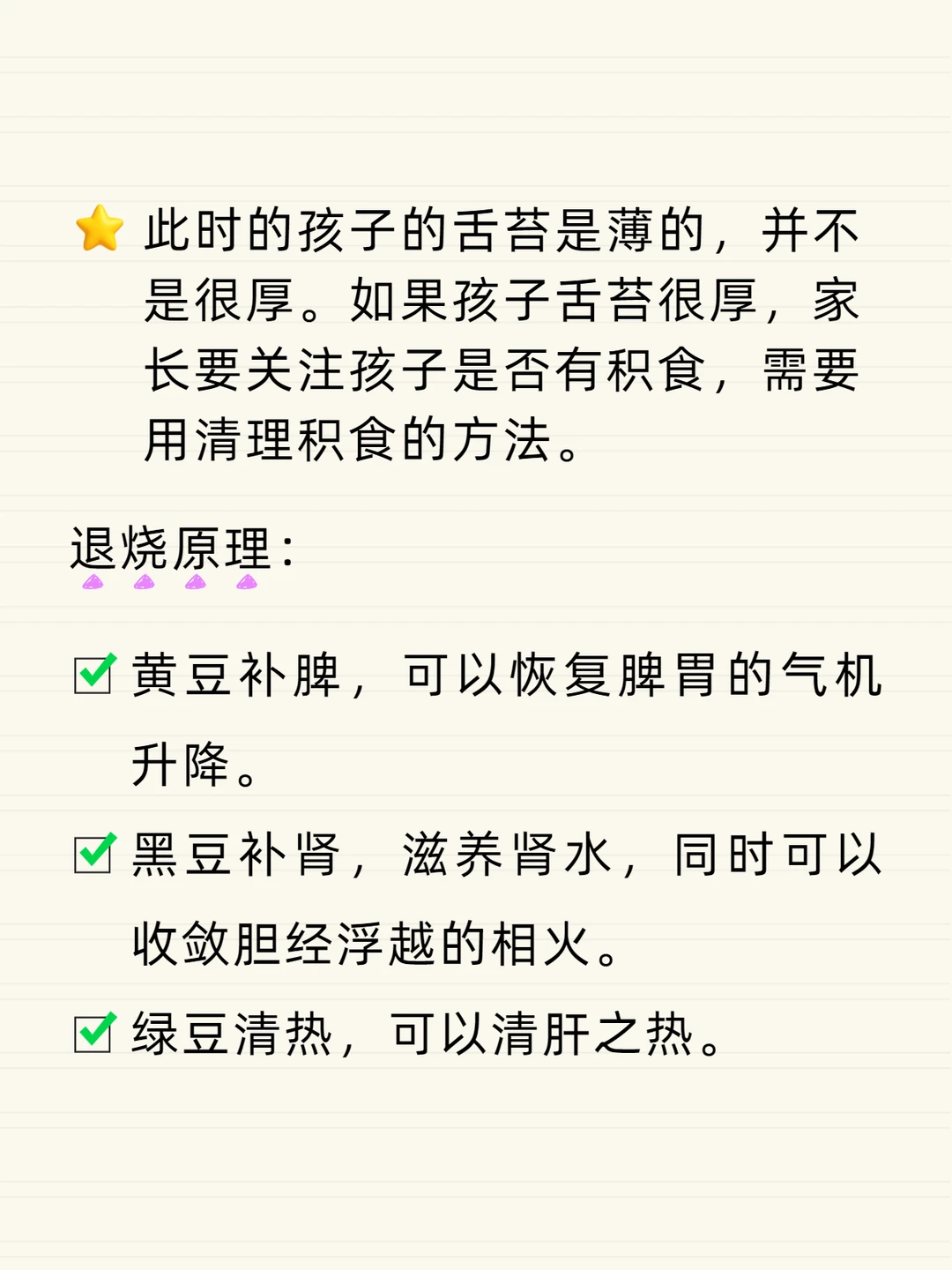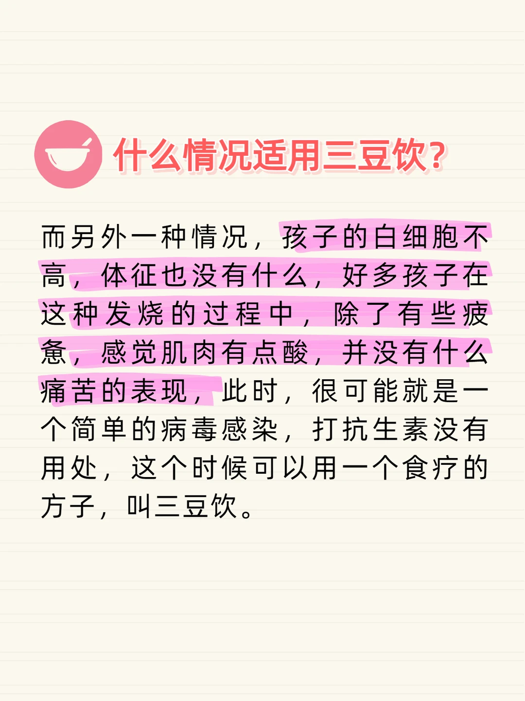 🌟什么情况适用三豆饮 孩子的白细胞不高,体征也没有什么,好多孩子在这种发烧的过程中,除了有些疲惫,感觉肌肉有点酸,并没有什么痛苦的表现,此时,可以用一个食疗的方子,叫三豆饮。 ⭕三豆饮 三豆饮其实自古就有,最早传说是扁鹊开过,是红豆、绿豆、黑豆三种豆,后来,在清代的彭子益的《圆运动的古中医学》里,他把红豆去掉,改成了黄豆,用来治疗温病发热。 ▶三豆饮做法 黄豆、黑豆、绿豆各一把(50g),豆子可以提前浸泡一晚,然后锅里多加点水,大火熬开,小火慢熬不少于2小时,最后熬成豆沙状即可。 ▶注意事项: 这个方子必须当日煮当日喝,不能隔夜,隔夜以后效果会差很多。 这个汤可多次喝,不限次数及量,其实这也就是豆沙饮料,以孩子可以承受量次为准。 此时的孩子的舌苔是薄的,并不是很厚。如果孩子舌苔很厚,家长要关注孩子是否有积食,需要用清理积食的方法。 ▶退烧原理: 黄豆补脾,可以恢复脾胃的气机升降。 黑豆补肾,滋养肾水,同时可以收敛胆经浮越的相火。 绿豆清热,可以清肝之热。 通俗的讲,就是此时患外感热证,必定是正气不足,所以,用黄豆补脾,黑豆补肾,绿豆清热,道理简单,操作简便。 罗大伦 育儿 三伏天养生 饮料日常 三豆饮 退烧 宝宝发烧 黄豆 绿豆