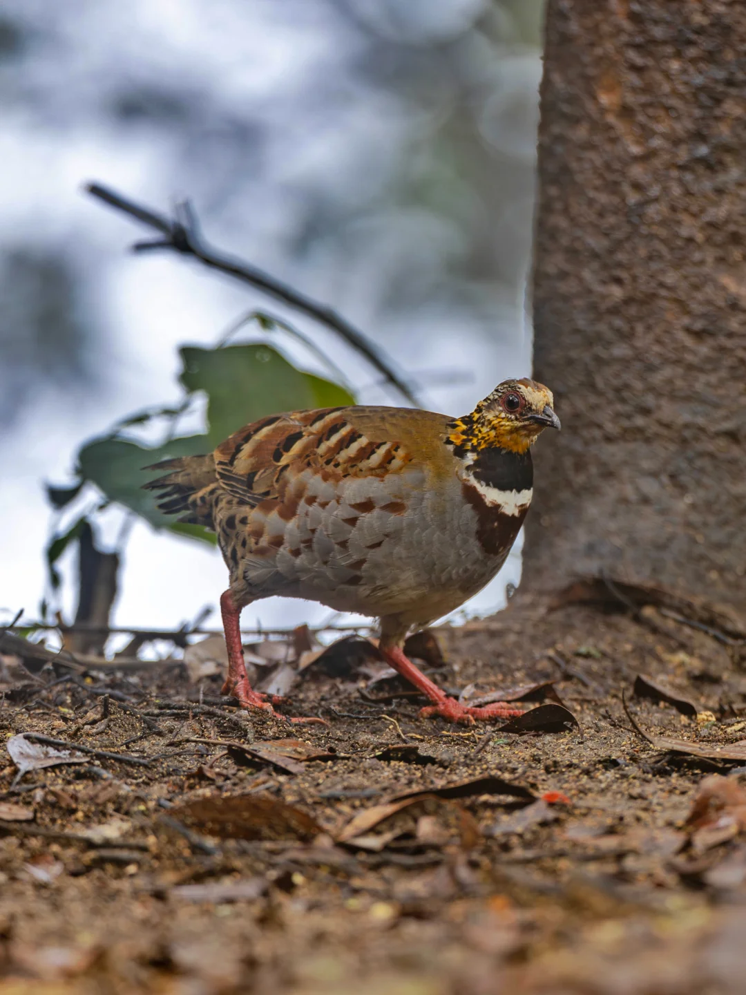 白眉山鹧鸪通常喜欢生活在树木茂密的森林里,由于林子通常比较密,发现难度较大。曾经几次在广东的树林里看到白眉山鹧鸪,都没有看到其全身。这次在南岭,大雨从早下到中午,雨刚停整个树林都弥漫着浓雾,看上去不可能散掉,本来觉得希望渺茫,没想到突然有一个小家庭的白眉山鹧鸪从雾中走出来。不过由于胆子太小,瞬间溜走,可能最小的成员胆子略大,稍微靠近一点点。后期使劲去雾,没想到还可以。