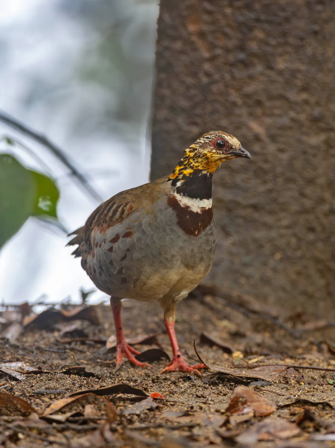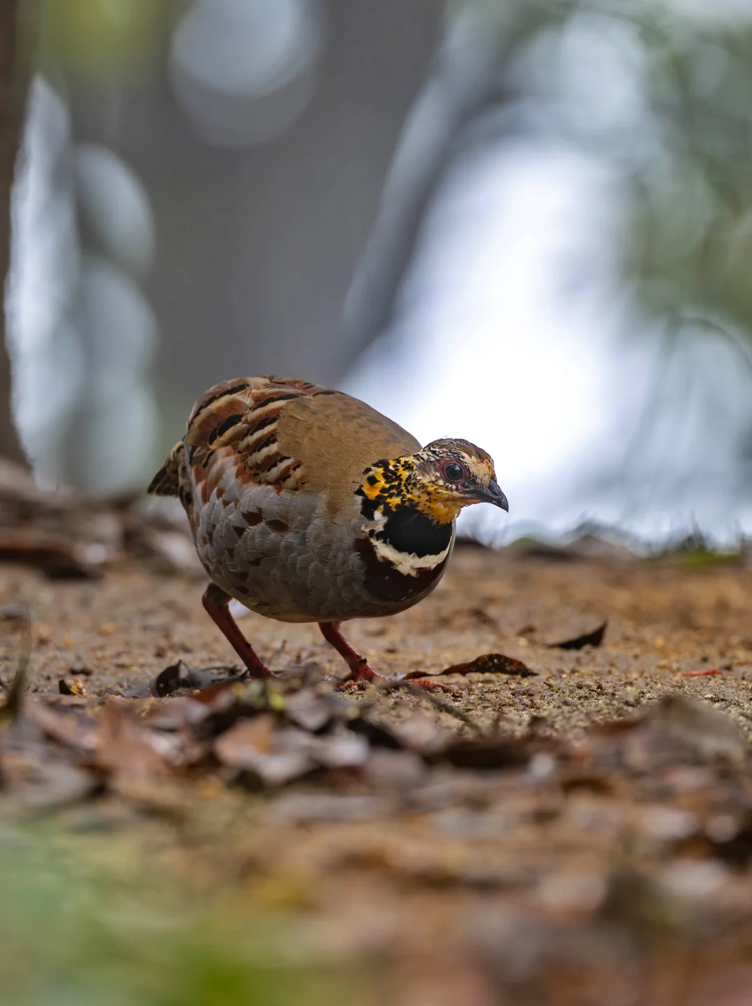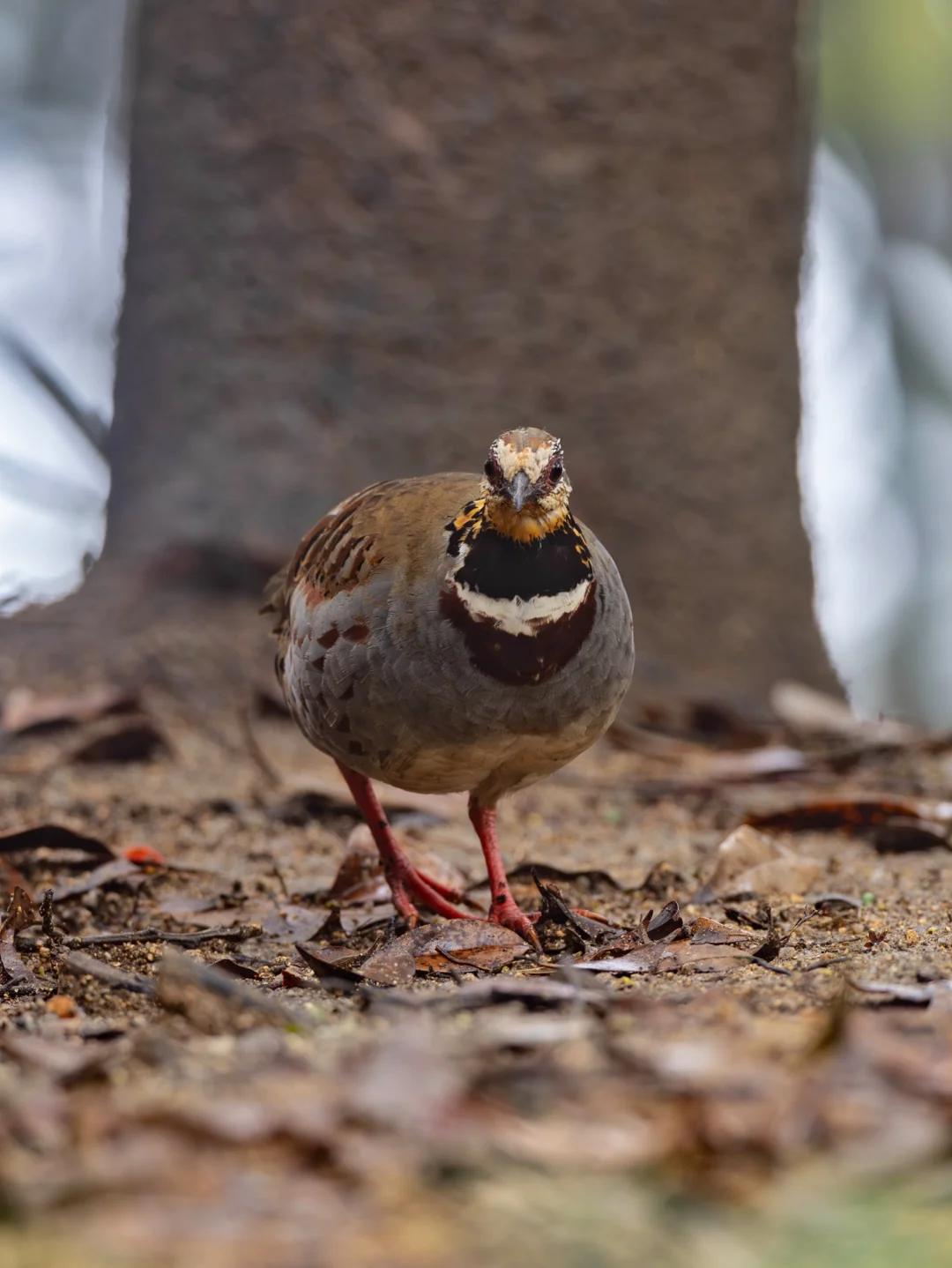 白眉山鹧鸪与其说是白眉,不如说是白项圈,他们的头部纹路和黑白胸带都非常的独特,镶嵌颈侧黄色与喉部橙红色。