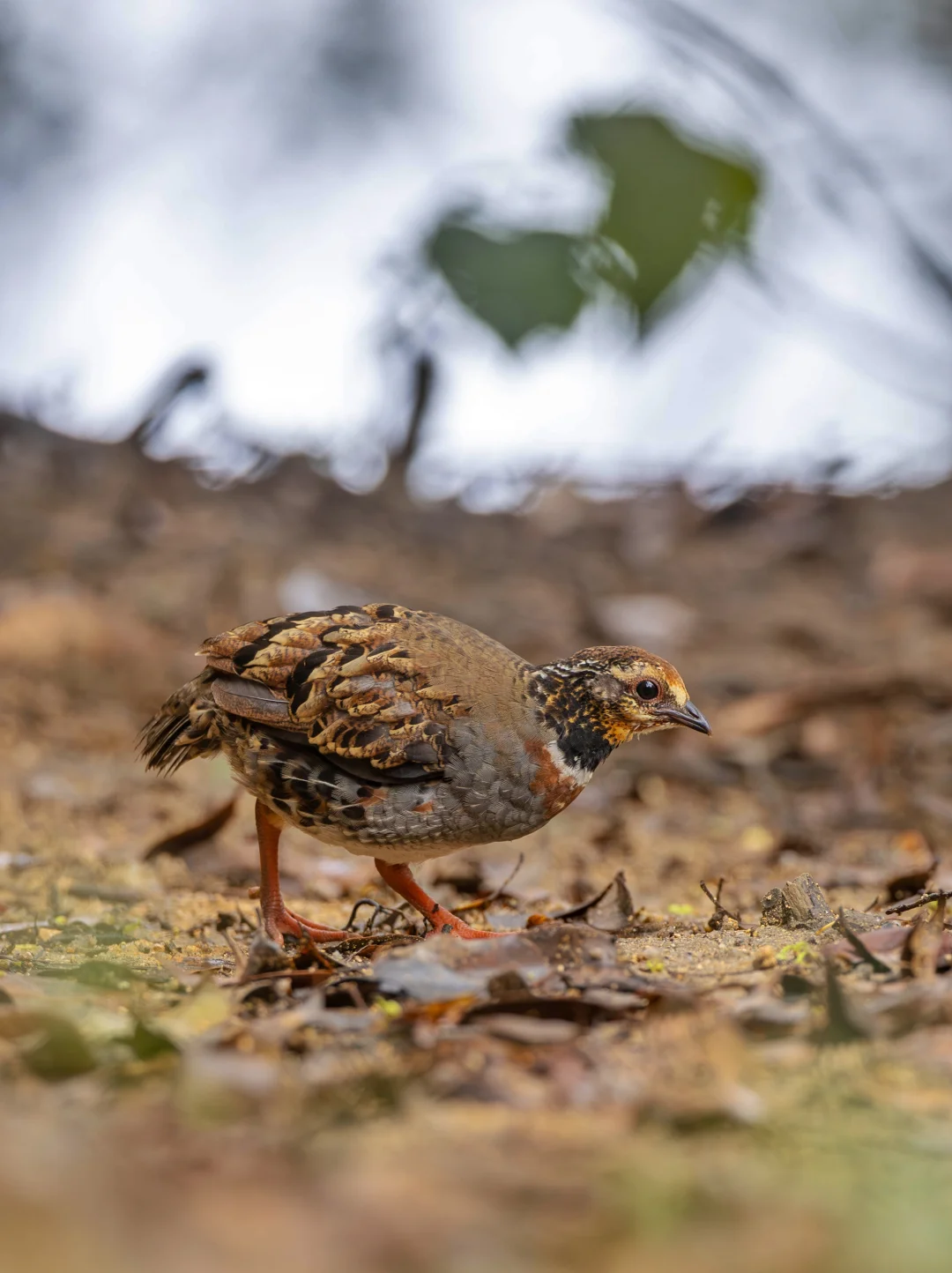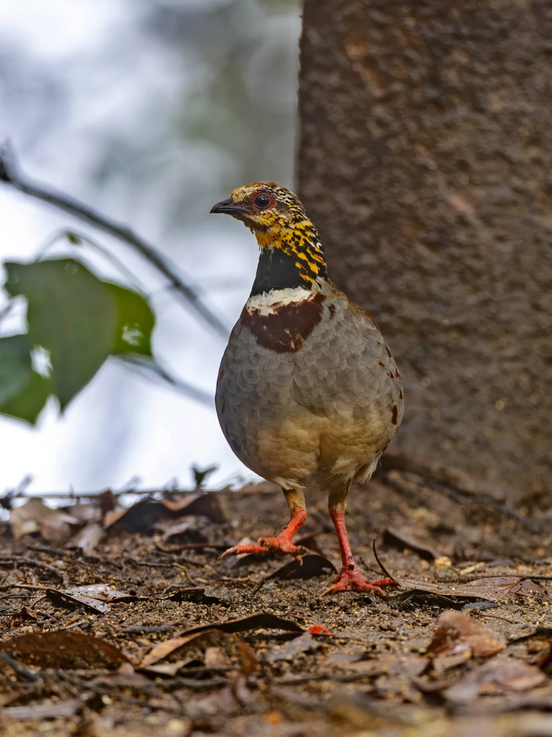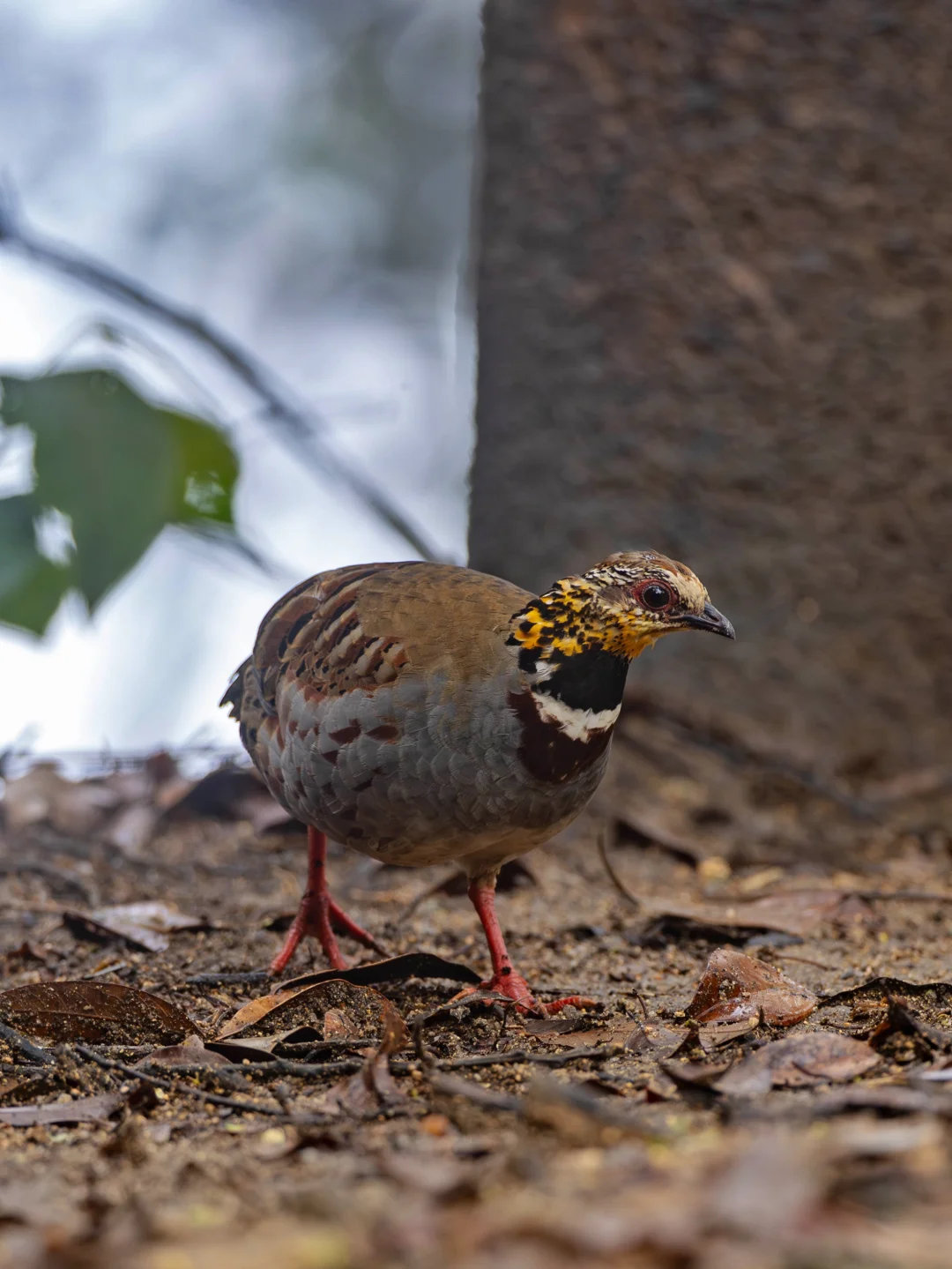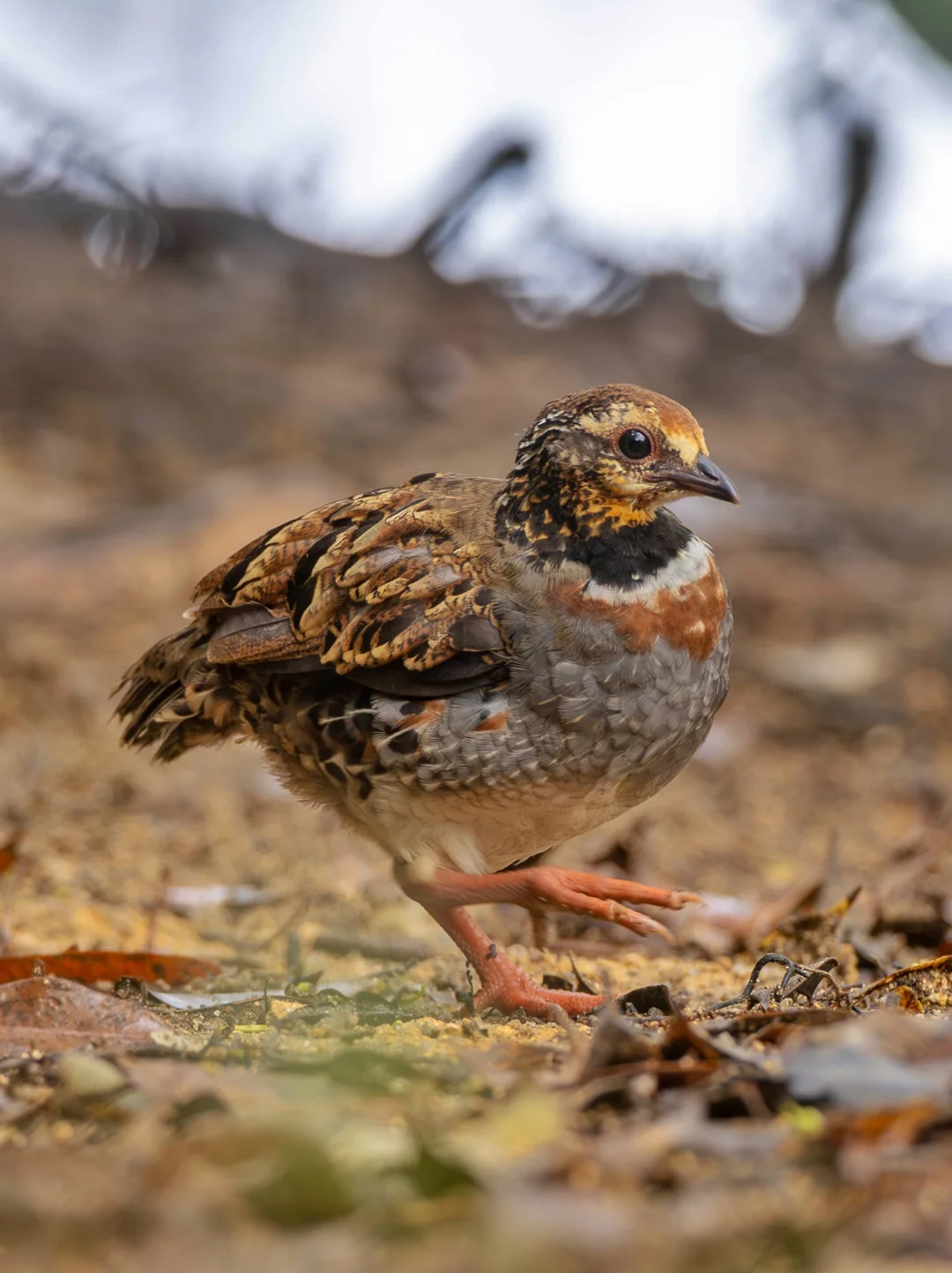 白眉山鹧鸪与其说是白眉,不如说是白项圈,他们的头部纹路和黑白胸带都非常的独特,镶嵌颈侧黄色与喉部橙红色。