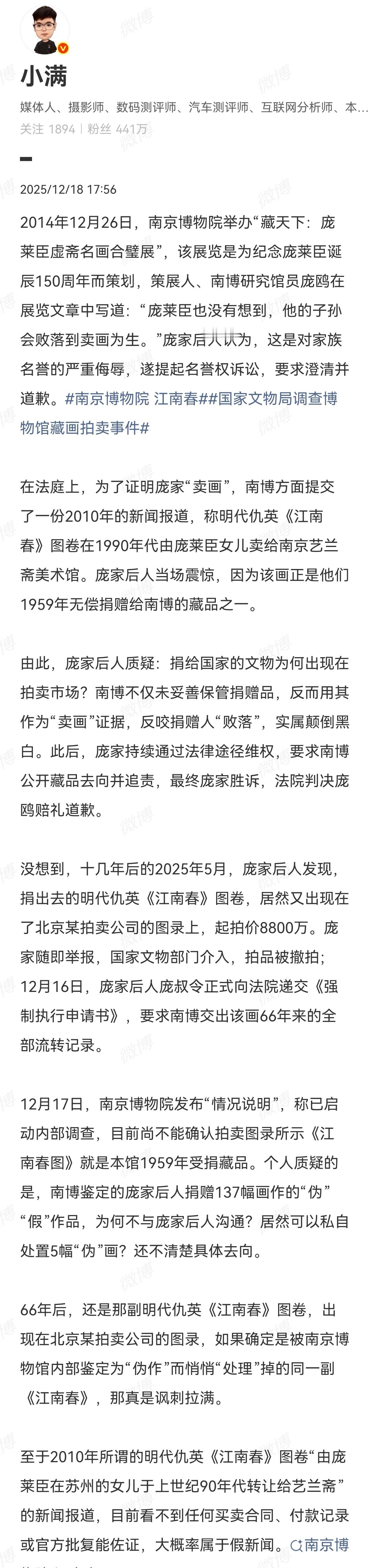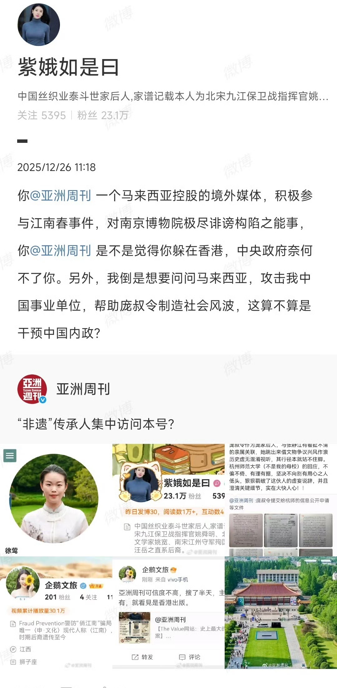 近期,《亚洲周刊》持续关注南京博物馆藏画拍卖事件,并针对南博前院长徐湖平、徐湖平父亲是谁、徐莺是否为“庞氏后人”等进行独家披露。时事满谈《亚洲周刊》背后大股东为马来西亚华人企业家张晓卿控制的常青集团,作为一家境外媒体,选择在相关部门调查南博藏画《江南春》拍卖事件的窗口期,借徐湖平被调查个例事件高频发声,进行过度衍生、解读,客观放大了该事件造成的社会冲击力。媒体应该有社会责任感,就事论事,等待官方调查结果,而非是唯恐天下不乱的心态,进行“剧终”“南京拨物院”“估值40亿”“西汉金兽掉色”等衍生信息的大杂烩。