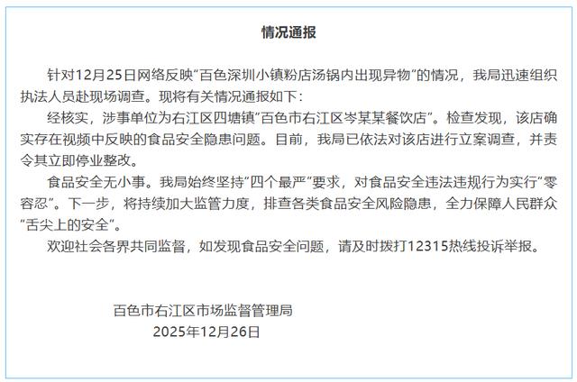 针对12月25日网络反映“百色深圳小镇粉店汤锅内出现异物”的情况,我局迅速组织执法人员赴现场调查。现将有关情况通报如下:
