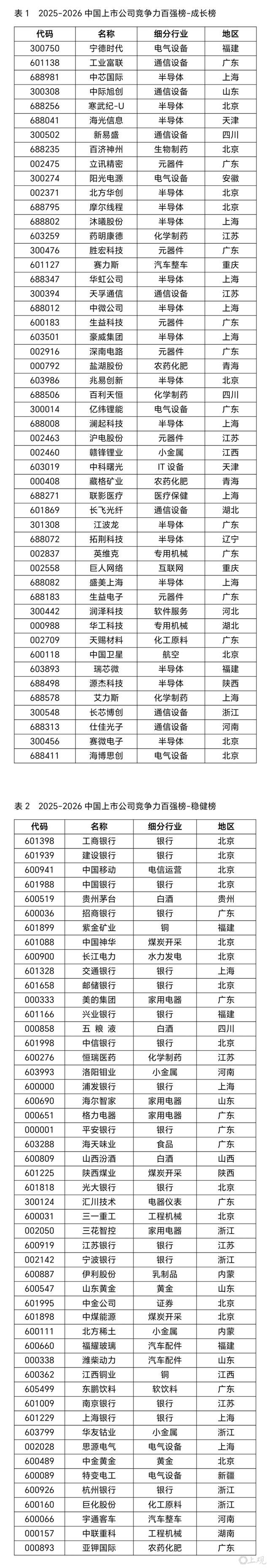 根据两分“风格”,中国上市公司竞争力百强榜分为“成长榜”50强与“稳健榜”50强。其中,“成长性”更注重企业成长空间和产业发展趋势,榜单公司主要分布于新兴优势产业,如半导体、人工智能、机器人、商业航天、医药医疗、新能源等相关科技属性行业。“稳健性”,则相对注重业绩稳定、现金流良好、高股息率等,榜单公司主要分布于银行、食品饮料、交通运输、煤炭电力、家电等传统行业。