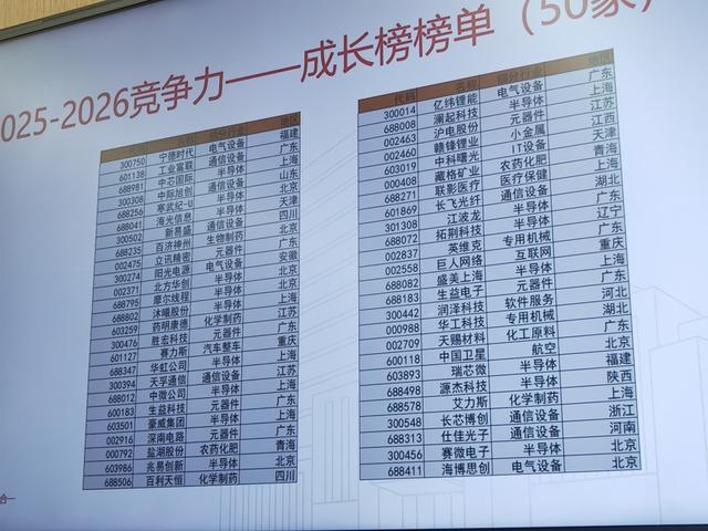 其中,在百强榜的成长榜50家中,从以工业富联、中际旭创、新易盛为代表的“通信设备”,到以中芯国际、寒武纪、海光信息为代表的“半导体”,这两大细分行业占据目前市值规模前列10家企业的六席。值得注意的是,作为新上市的科创板半导体企业,摩尔线程、沐曦股份等也在成长榜50家中上榜。