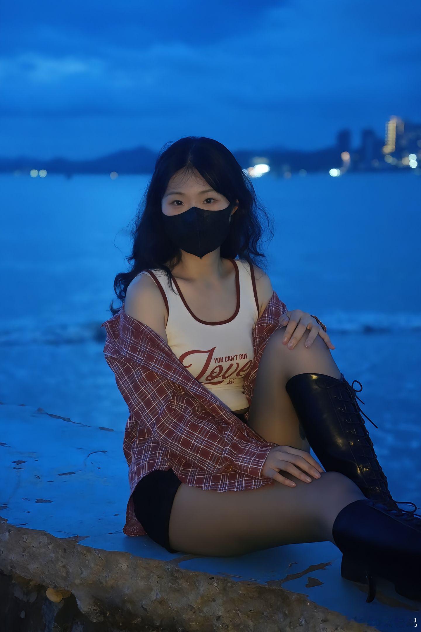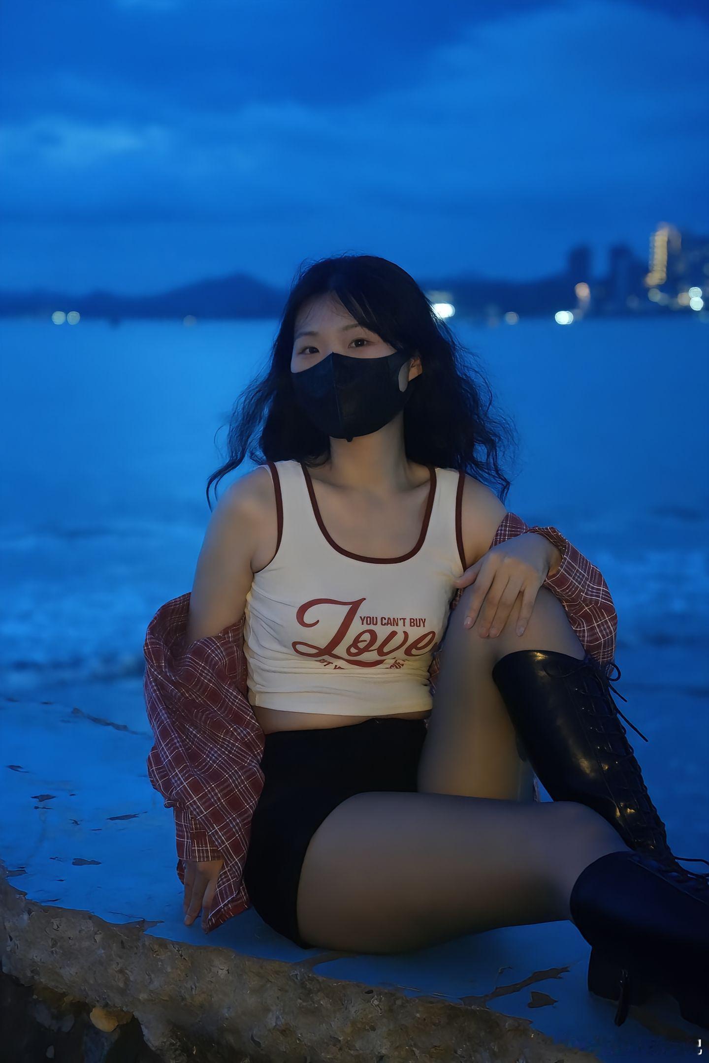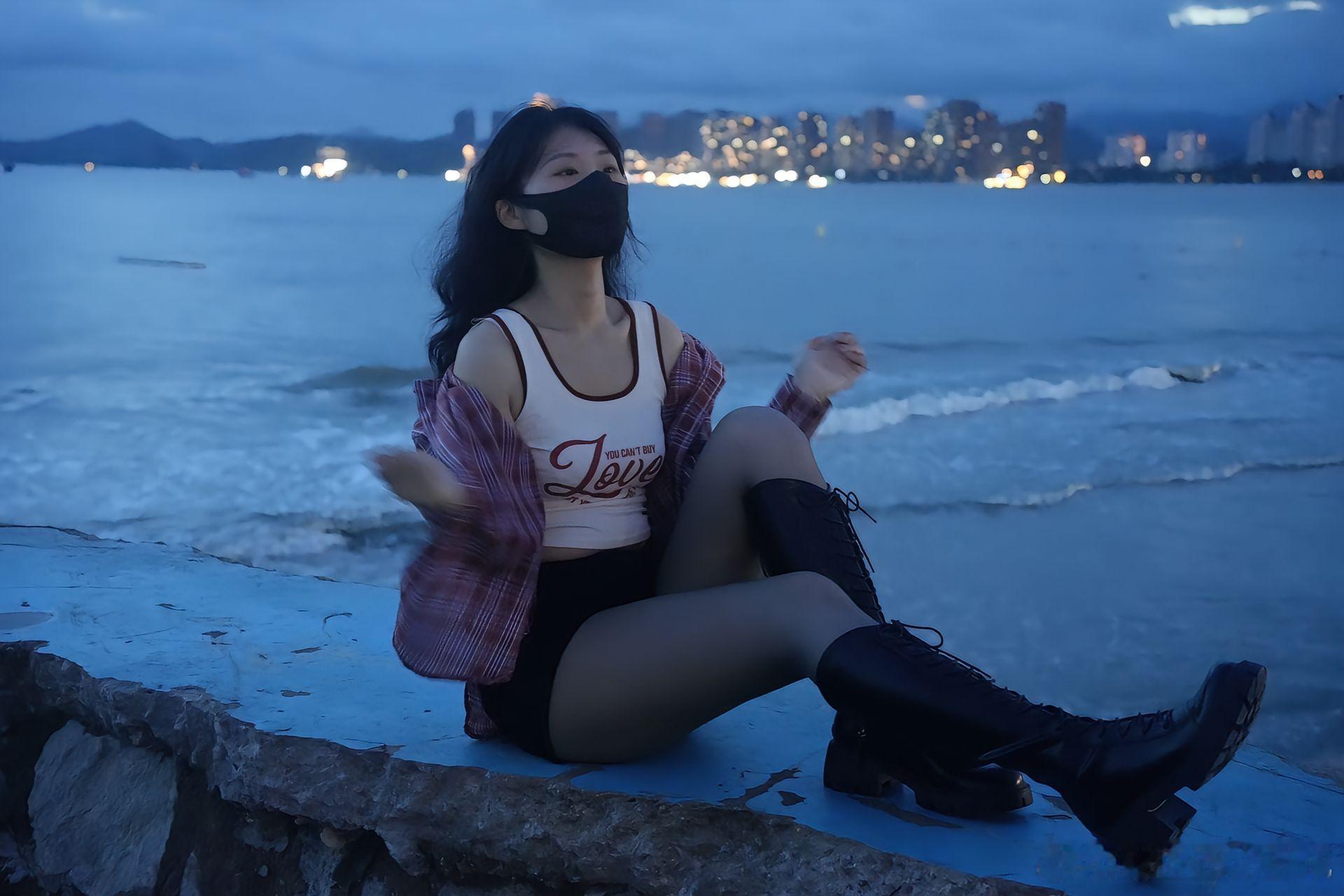 街拍 夜晚,吹着海边的风美女绘梦长廊