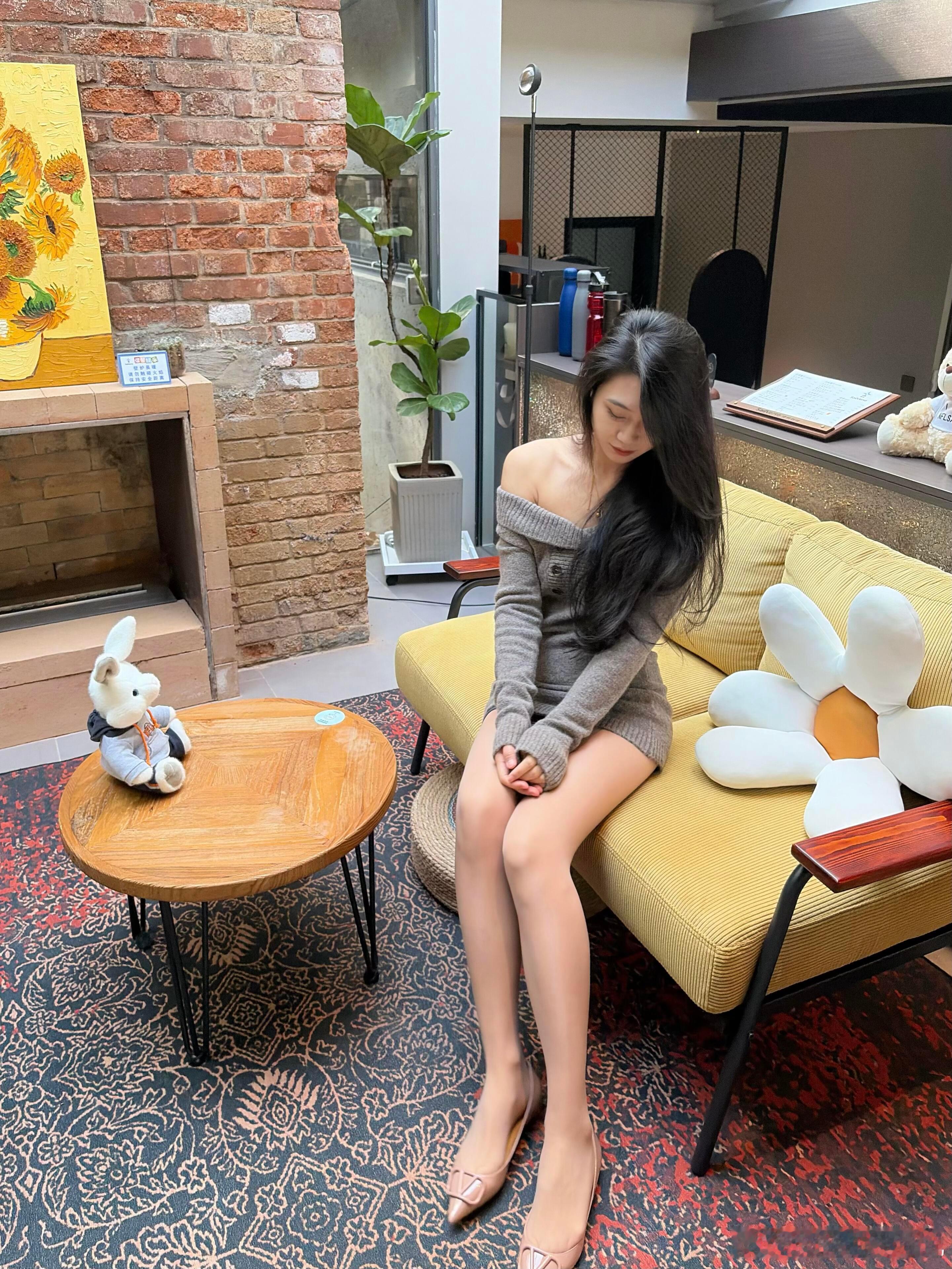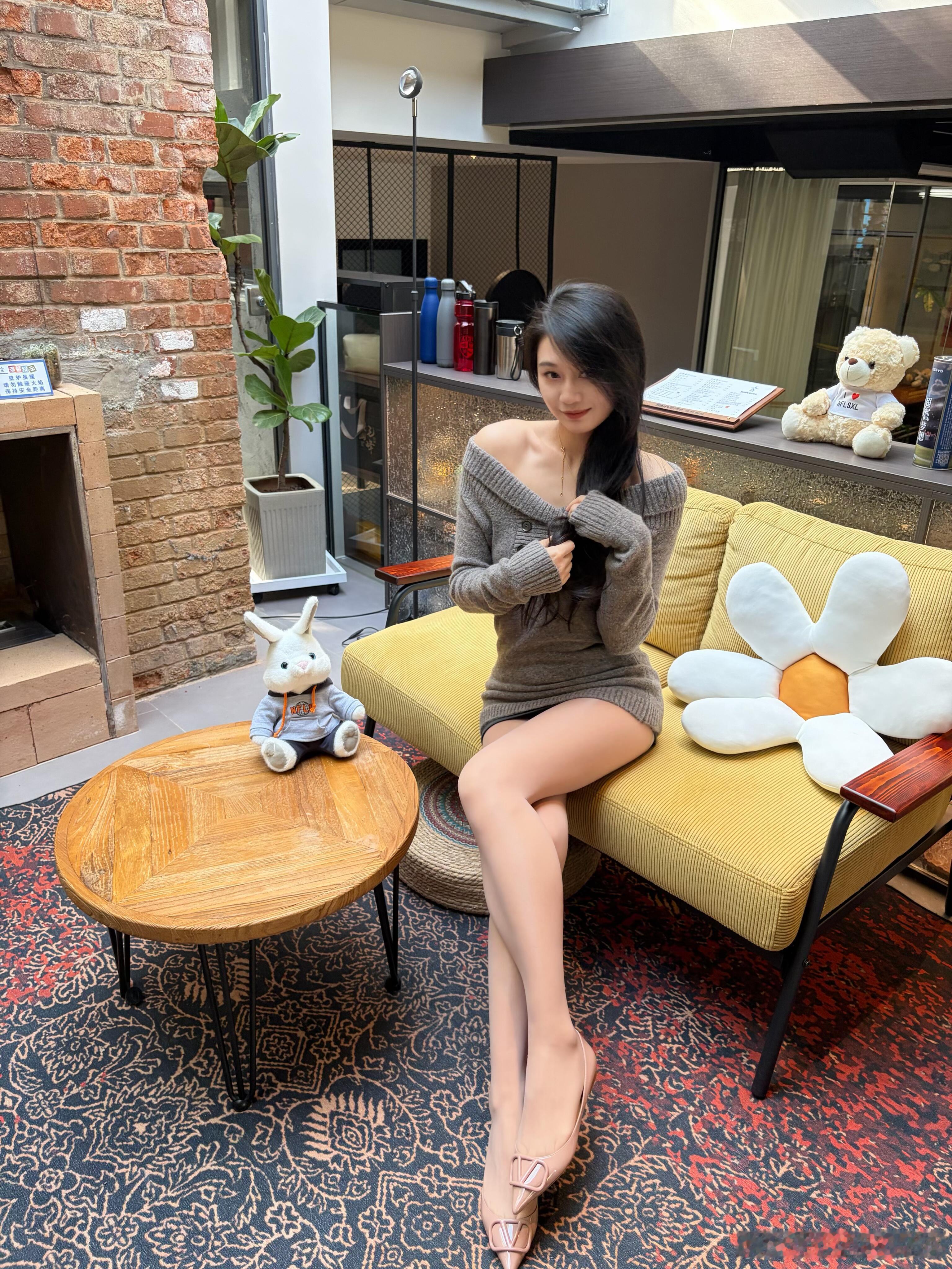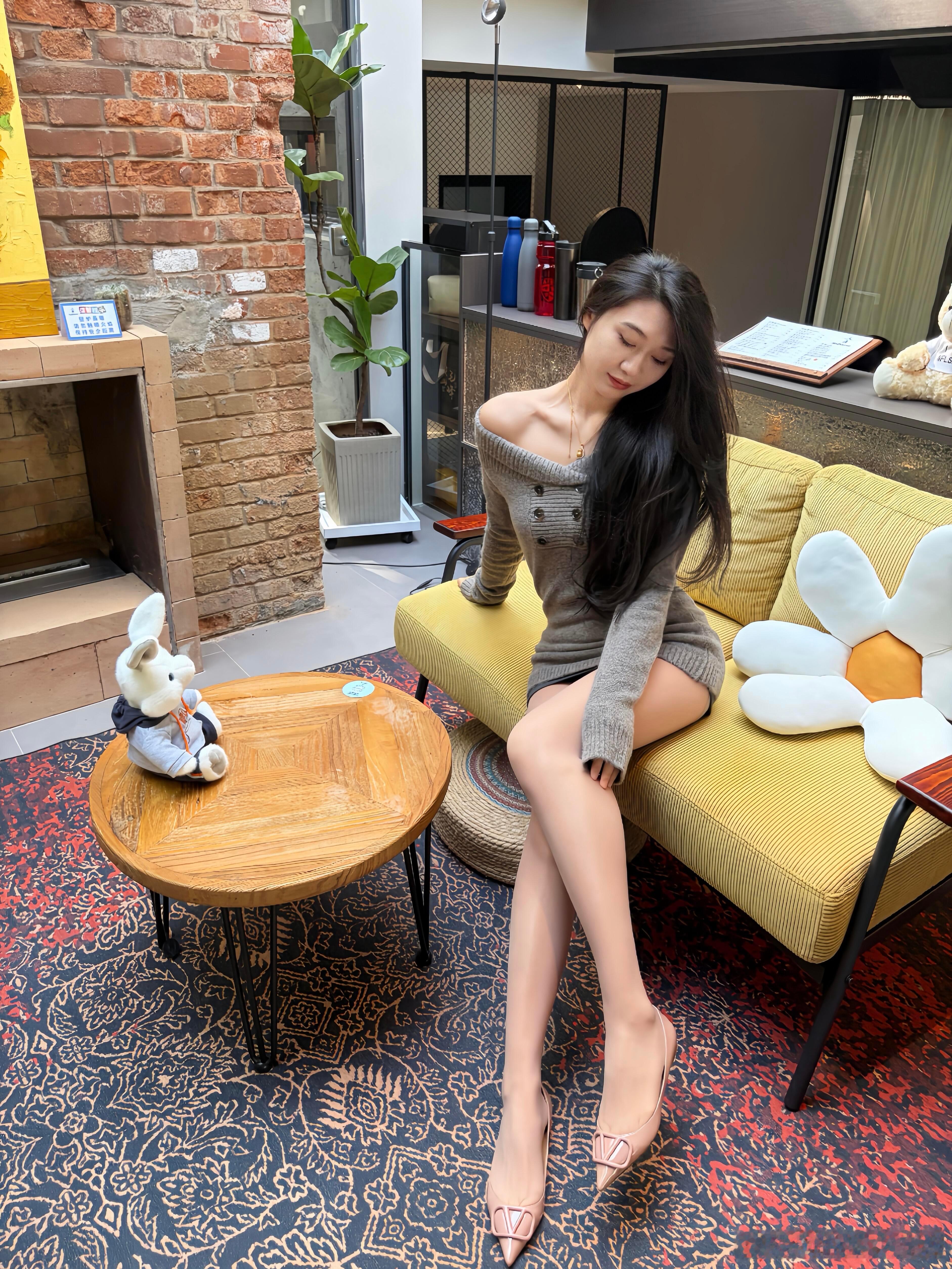 今天穿什么 一字肩小毛衣,超薄肉丝,粉色高跟鞋美女绘梦长廊