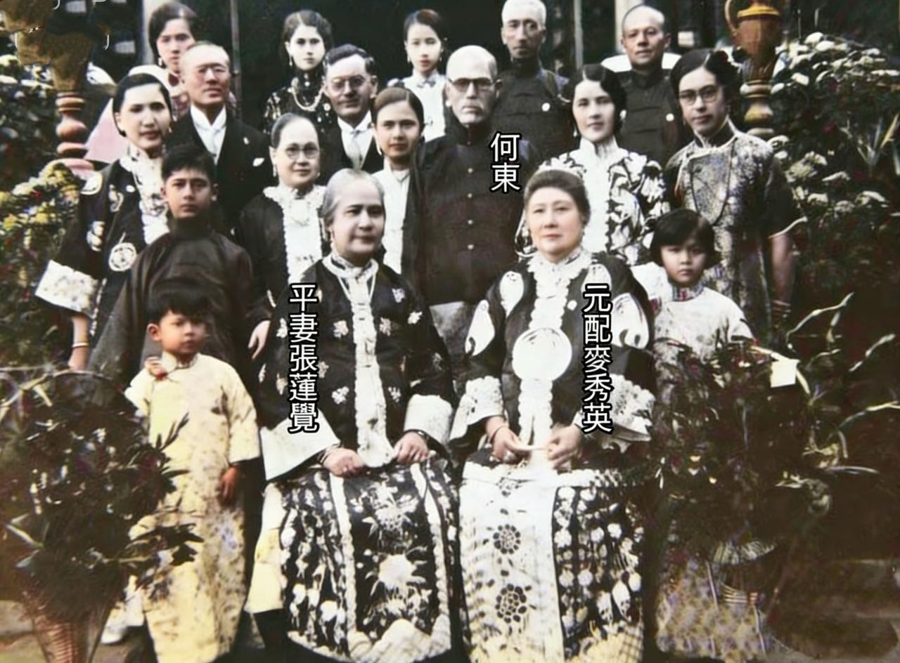 下图是早年香港华人首富何东的全家福,从照片来看,他有两位平妻,一位是原配麦秀英,